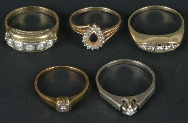 - Katalog-Nr: 2229Fünf Damenringe. 14 kt Gold, besetzt mit Brillanten und Diamanten, ca. 0,40 ct, Gesamtgewicht ca. 17,28 g, Ringgröße 54 bis 61.o.L.