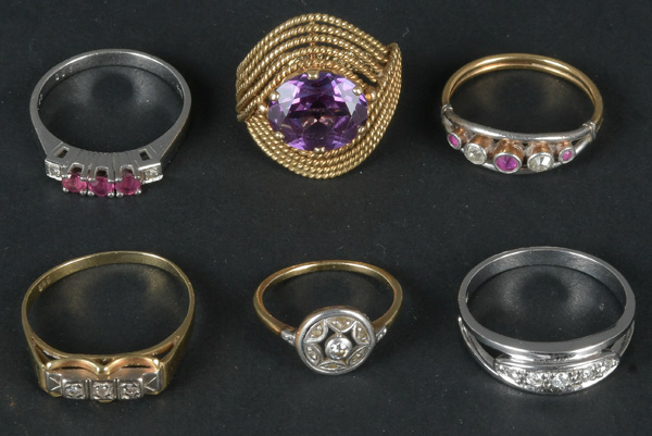 - Katalog-Nr: 2232Sechs Damenringe. 14 kt Gold, teilw. besetzt mit granat- und rubinfarbigem Stein, Gesamtgewicht ca. 13,02 g, Ringgröße 51 bis 61.o.L.