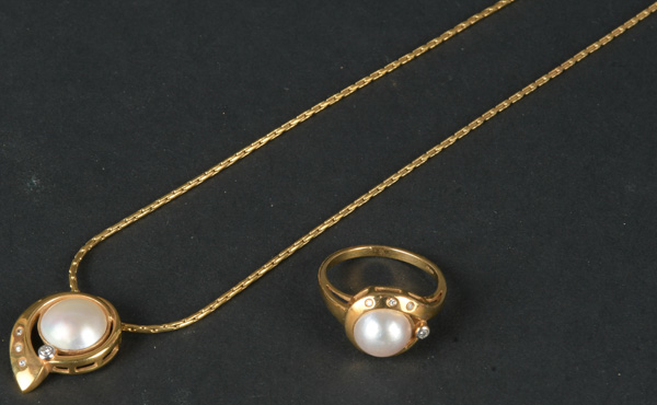- Katalog-Nr: 2233Anhänger, Gliederhalskette und Damenring. 14 kt Gold, besetzt mit Brillanten, ca. 0,10 ct, und Perlen, Gesamtgewicht ca. 16,05 g, L=44 cm, Ringgröße 57.o.L.