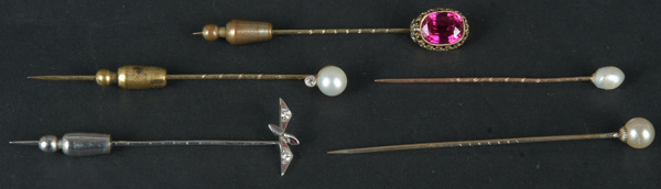 - Katalog-Nr: 2237Fünf Anstecknadeln. 14 kt Gold, besetzt mit Brillant, ca. 0,06 ct, Perlen und rubinfarbigem Stein, Gesamtgewicht ca. 6,13 g.o.L.