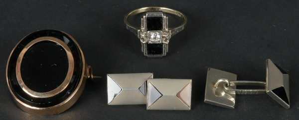 - Katalog-Nr: 2238Brosche, Damenring und Manschettenknöpfe. 14 kt Gold, besetzt mit Onyx, Gesamtgewicht ca. 17,36 g, Ringgröße 58.o.L.