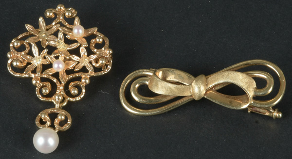 - Katalog-Nr: 2240Zwei Broschen. 14 kt Gold, eine besetzt mit Perlen, Gesamtgewicht ca. 9,69 g.o.L.
