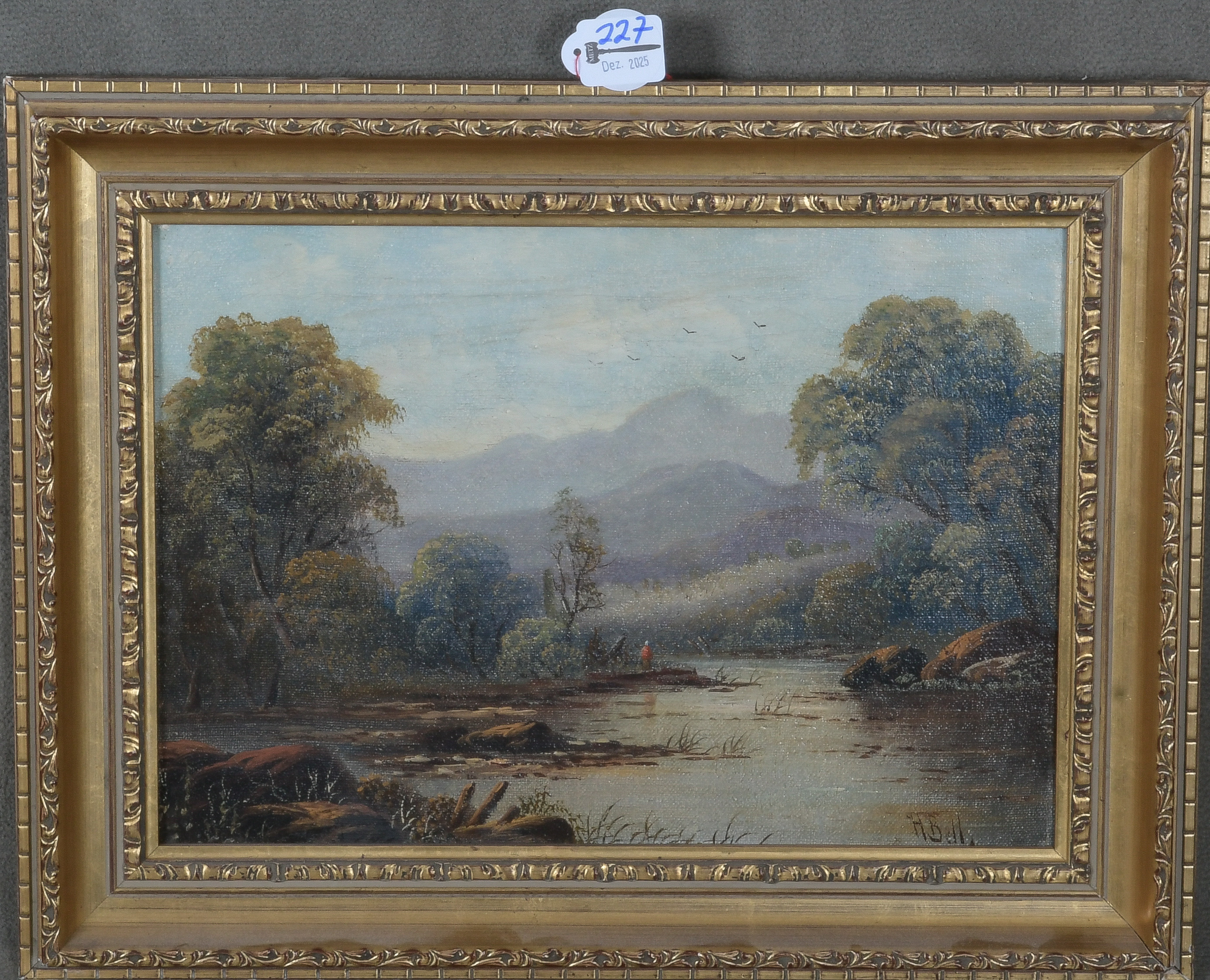 - Katalog-Nr: 227H. Bell (Maler des 20. Jhs.). Flusslandschaft mit Personenstaffage und Bergen im Hintergrund. Öl/Lw., re./u./sign., gerahmt, 25,5 x 35 cm.o.L.