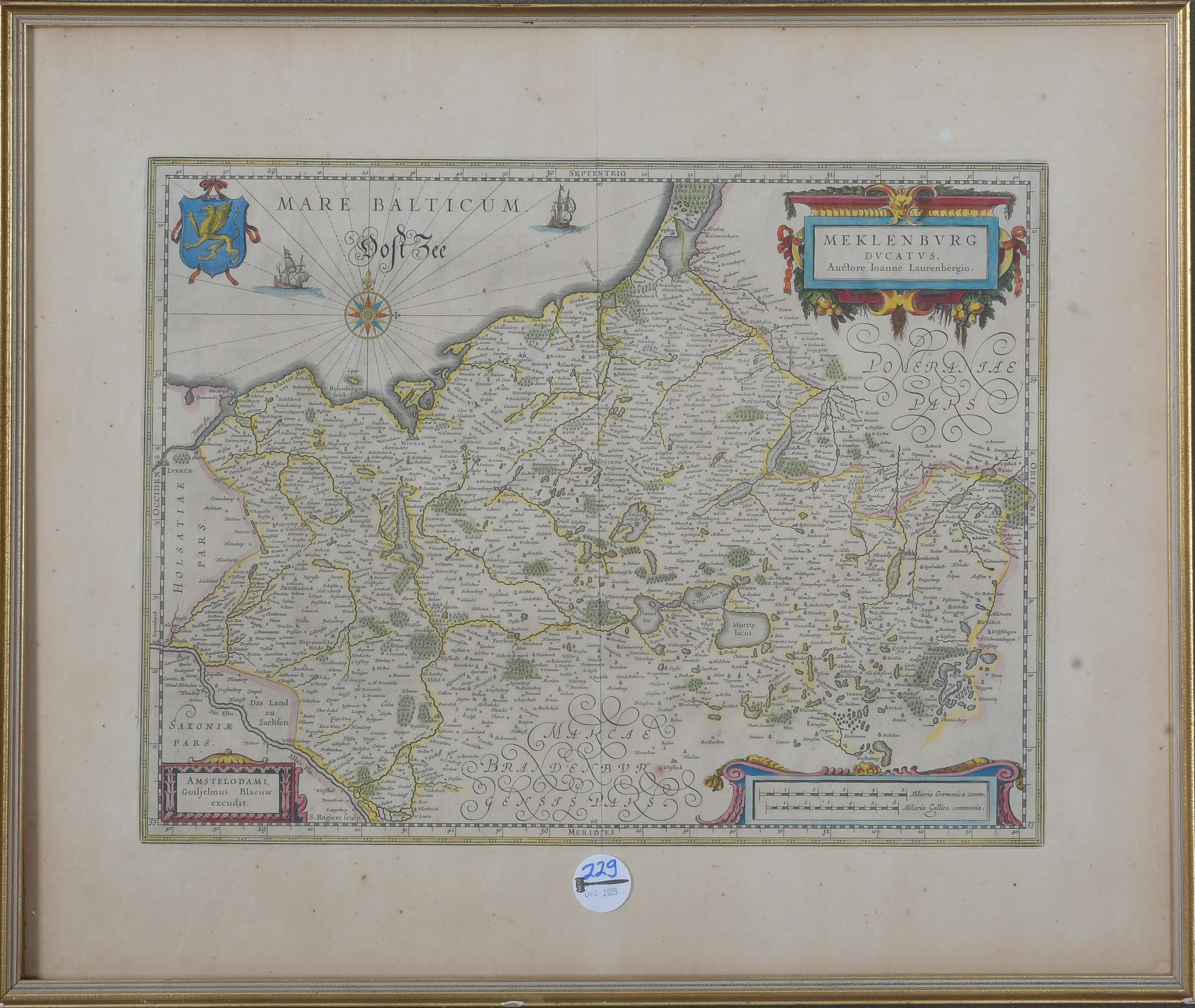 - Katalog-Nr: 229Johannes Wilhelm Lauremberg (1590-1658). Karte von Mecklenburg. Colorierter Kupferstich, re./o./sign., hi./Gl. gerahmt, 37 x 48 cm.o.L.