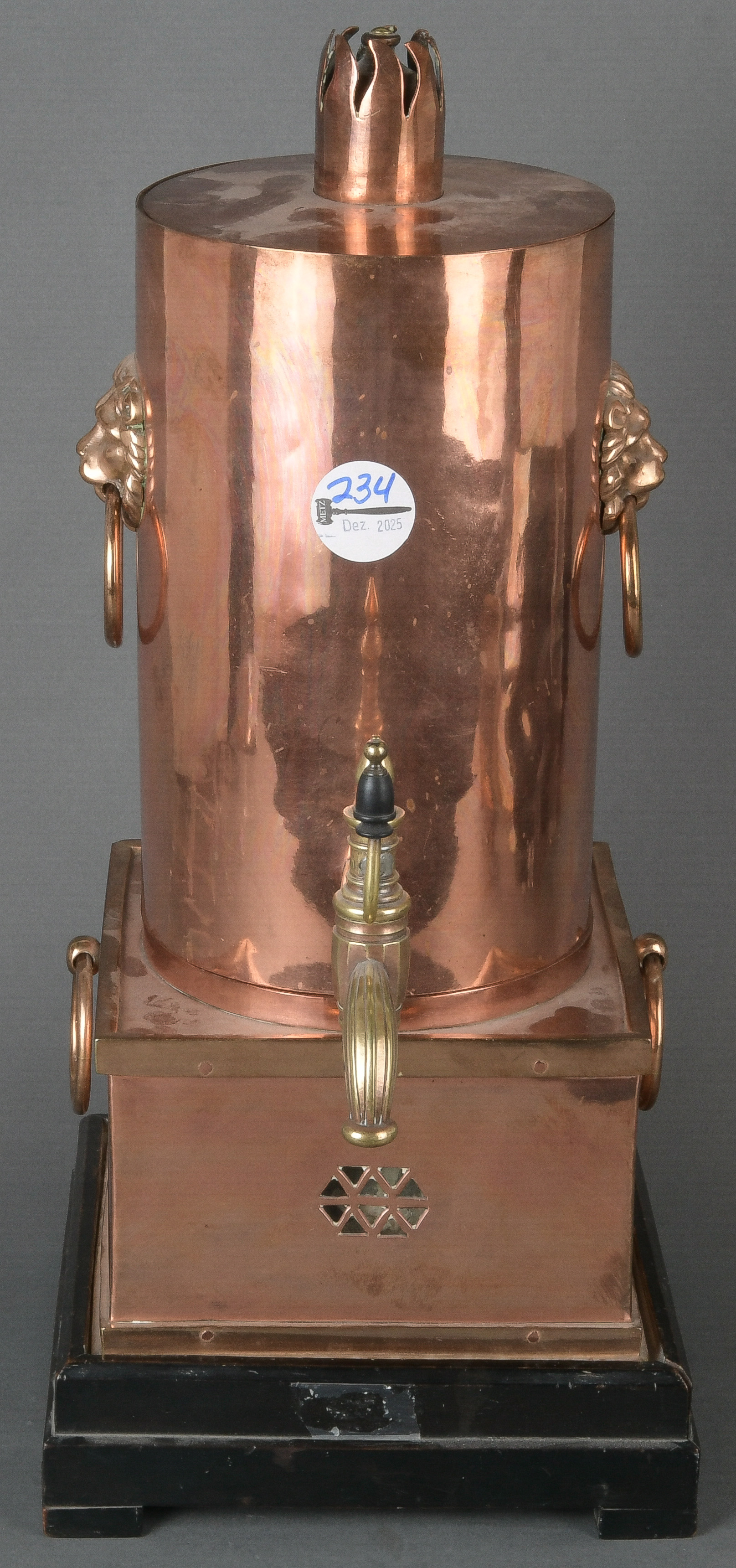 - Katalog-Nr: 234Samovar. Wohl Russland um 1900. Kupfer / Messing, auf Holzsockel, H=47 cm. (Funktion ungeprüft)o.L.