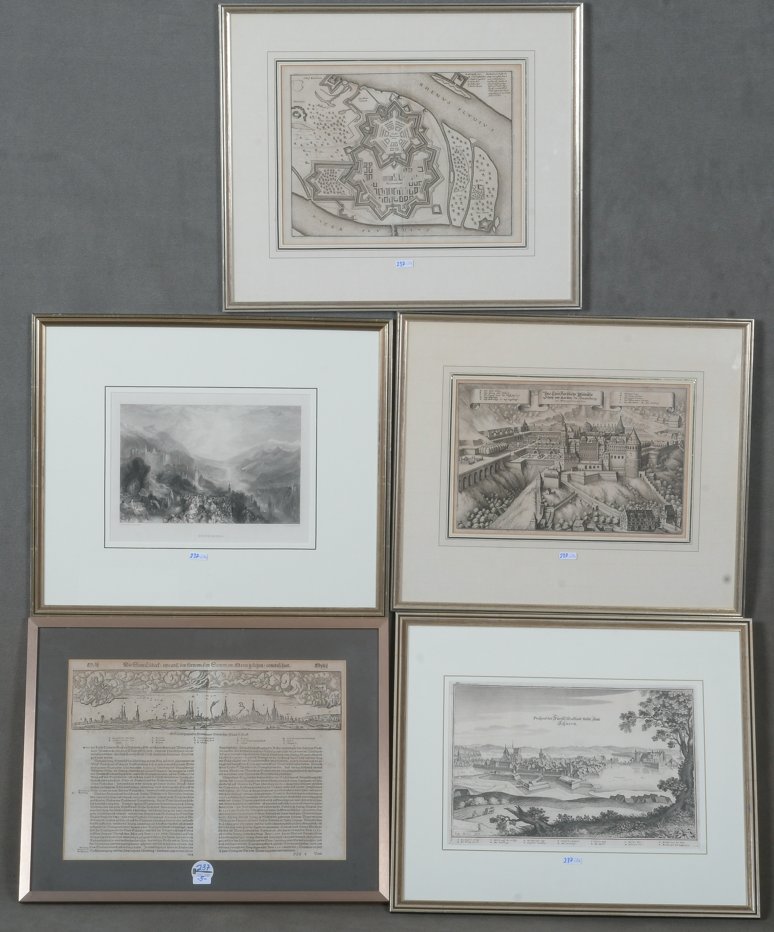 - Katalog-Nr: 237Fünf Kupferstiche, u.a. Matthäus Merian (1593-1650), Karte von Heidelberg und Mannheim; William Turner (1775-1851), Ansicht des Heidelberger Schlosses; Graphiker des 17./18. Jhs., Ansicht von Lübeck. Je mit Passepartout hi./Gl. gerahmt, 17,5 x 26 bis 27,5 x 39,5 cm.o.L.
