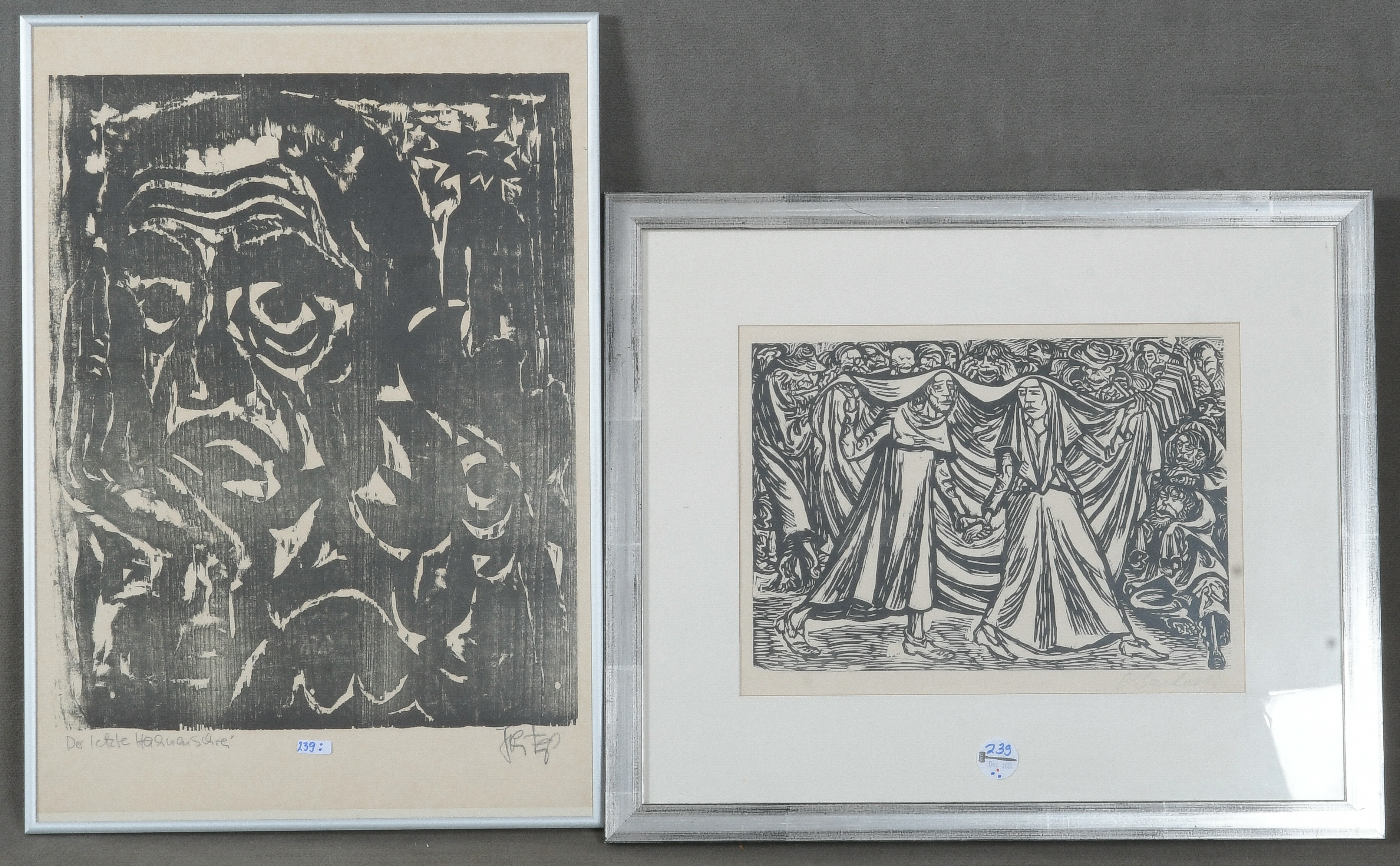 - Katalog-Nr: 239Ernst Barlach (1870-1938). „Totentanz". Blatt 4 aus der Mappe „Die Wandlungen Gottes". Holzschnitt, re./u./sign., mit Passepartout hi./Gl. gerahmt; dazu Johannes Feige (1931-2021). Der letzte Hahnenschrei. Holzschnitt, re./u./sign., hi./Gl. gerahmt, je 24,5 x 36 cm.o.L.