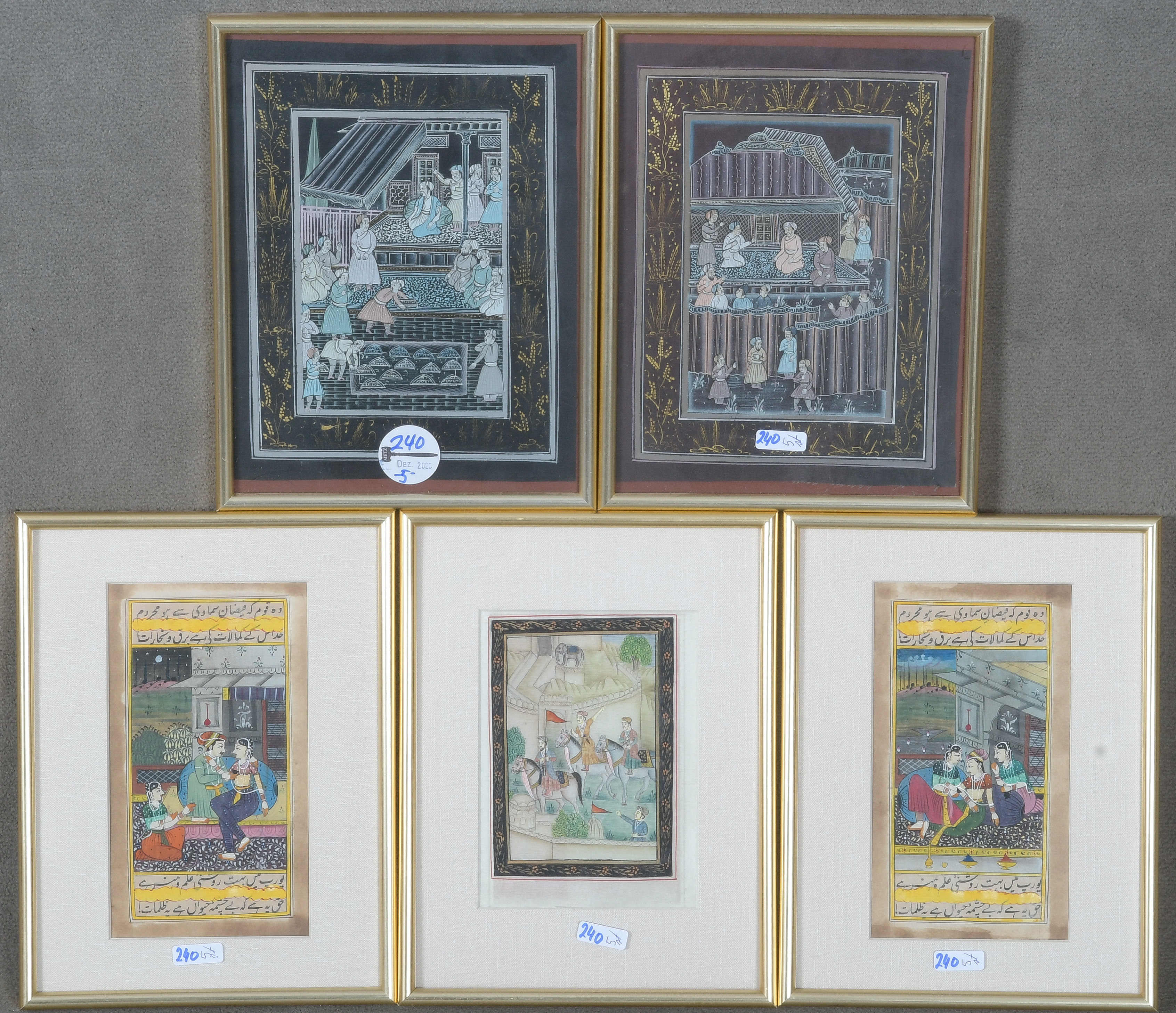 - Katalog-Nr: 240Persischer Maler des 20. Jhs. Fünf Szenen mit Personen im Tempel. Mischtechniken, drei mit Passepartout, je hi./Gl. gerahmt, 11,5 x 9,5 bis 16,5 x 8,5 cm.o.L.