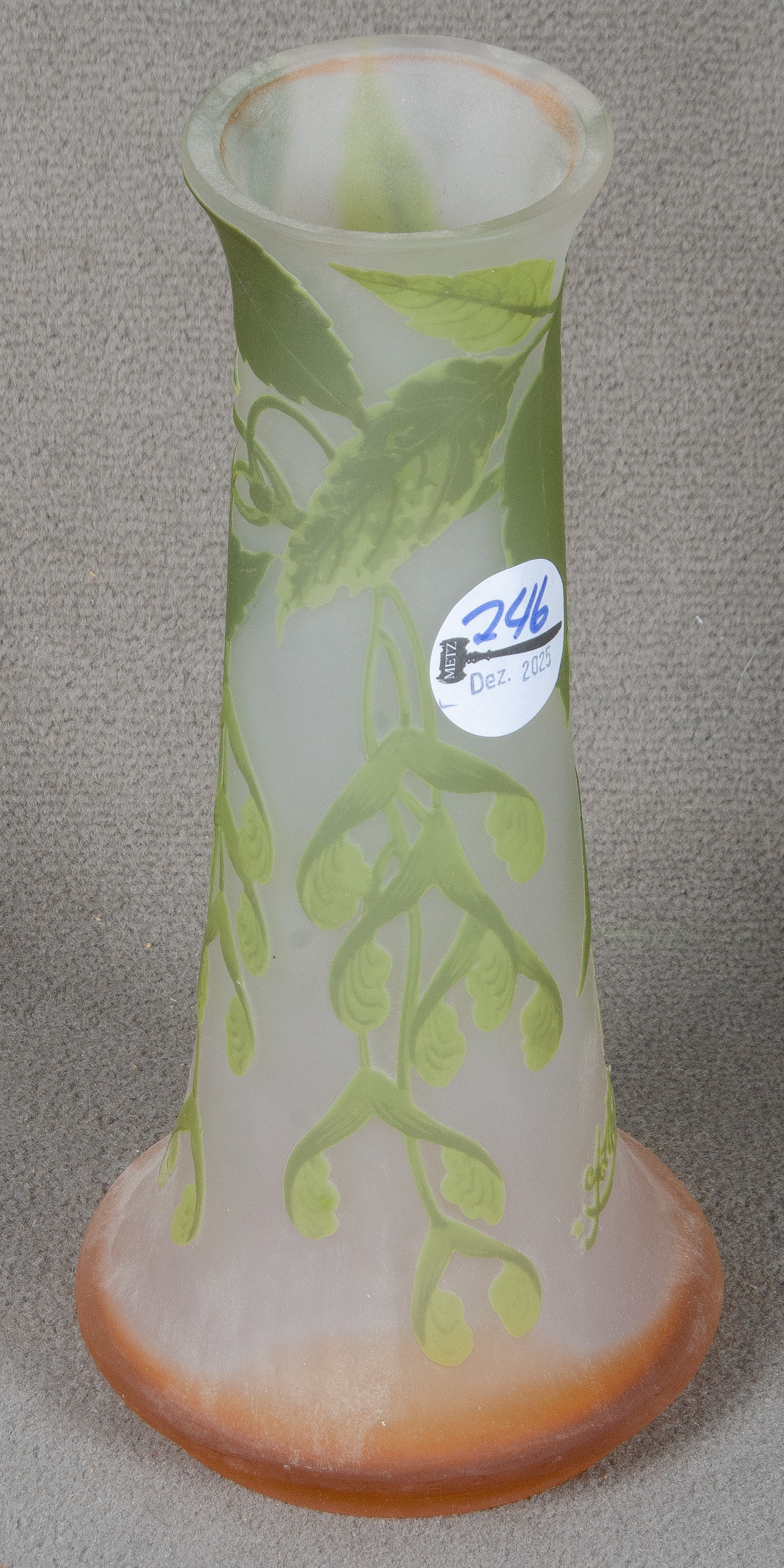 - Katalog-Nr: 246Jugendstil-Vase. Nancy, Émile Gallé um 1900. Farbloses Glas, farbig überfangen, umlaufend floral geschnitten und geätzt; an der Wandung sign., H=25 cm.o.L.