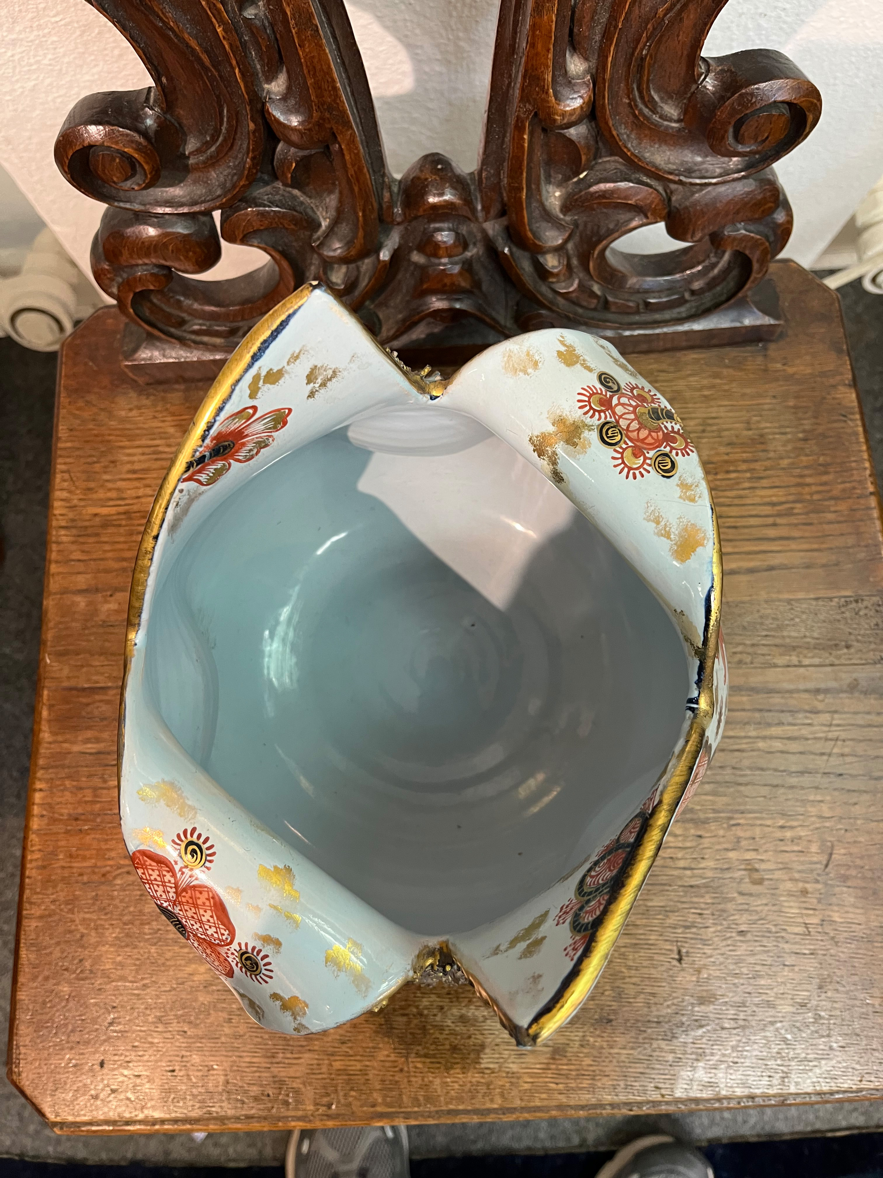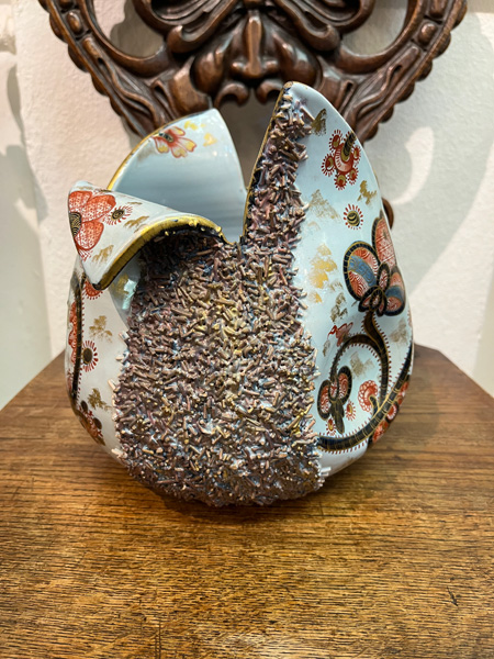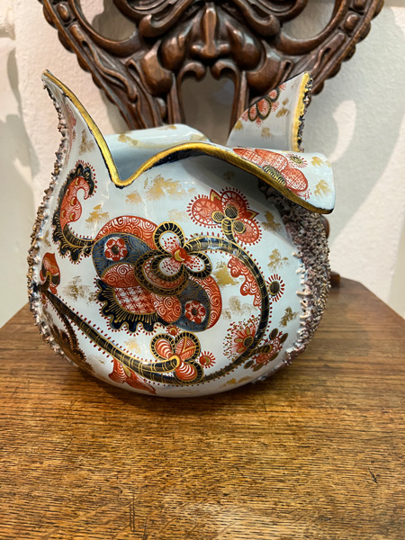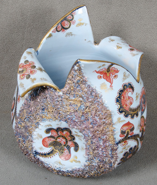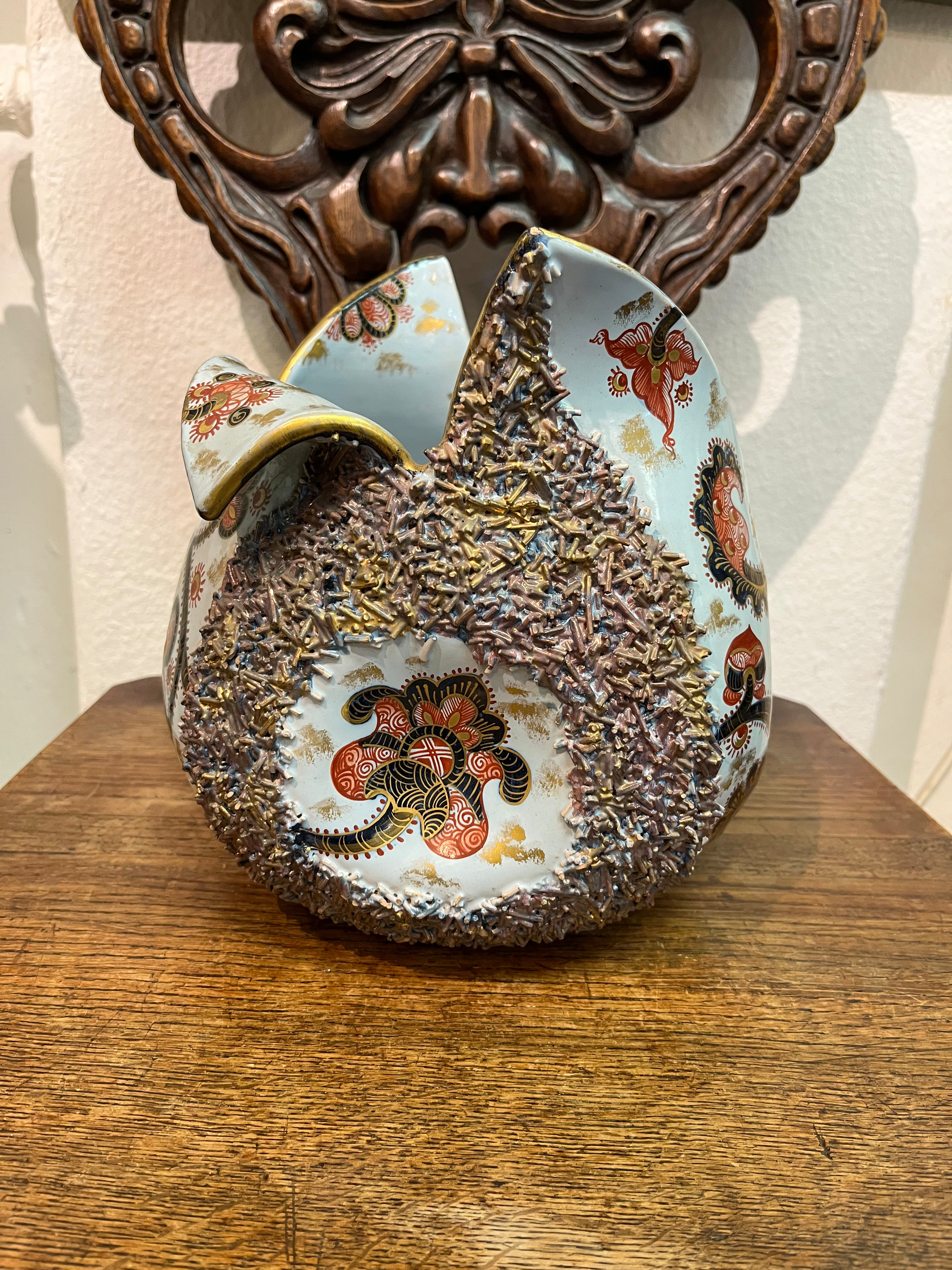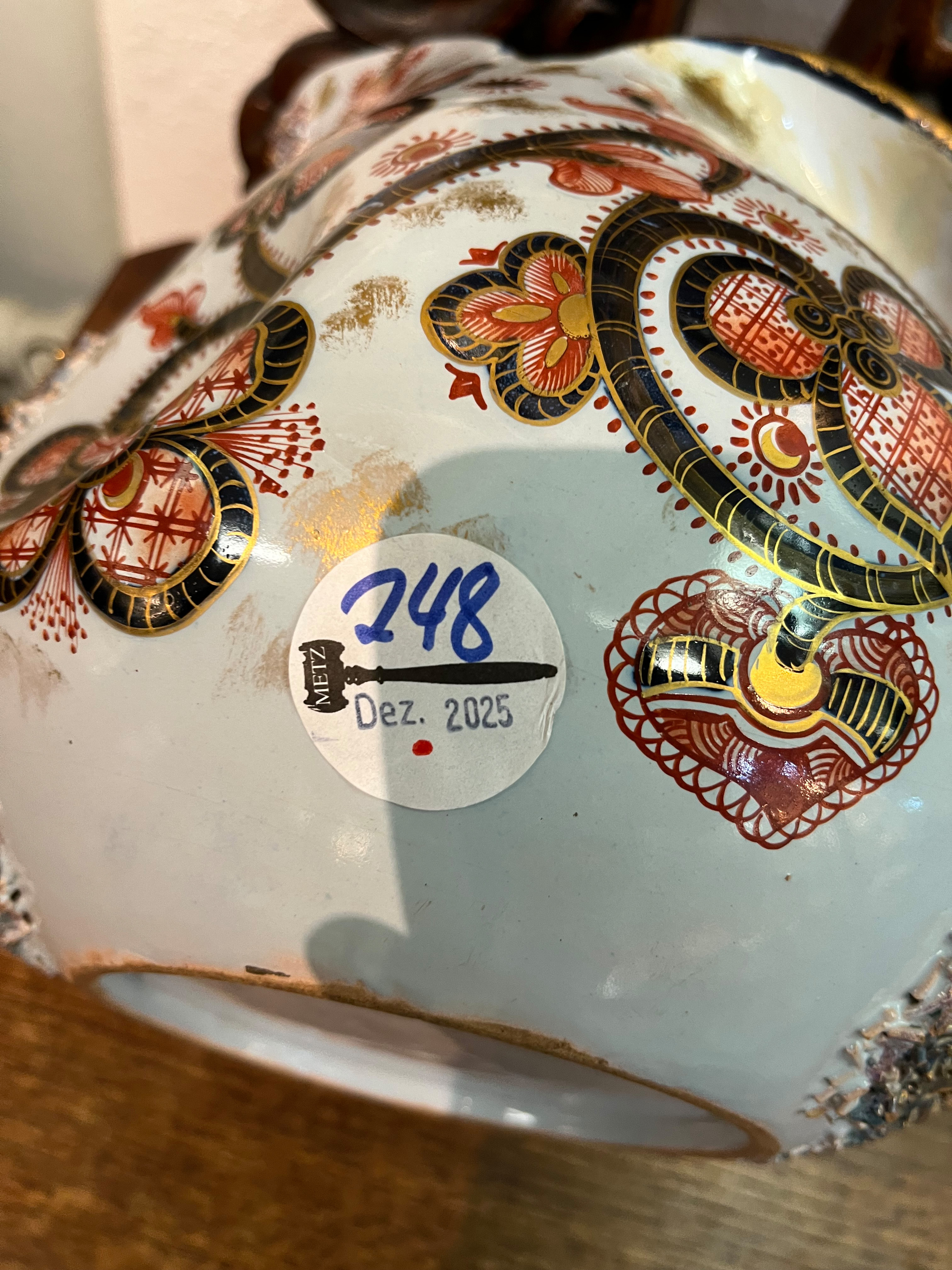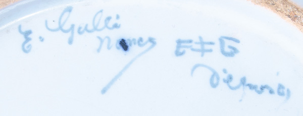 - Katalog-Nr: 248Jugendstil-Vase. Nancy, Émile Gallé um 1900. Keramik, mit aufbossiertem Reisigdekor, gold bemalt, hellblauem Fond und bunt gemaltem Floraldekor; am Boden Schriftzugsmarke, H=22,5 cm. (rest.)o.L.
