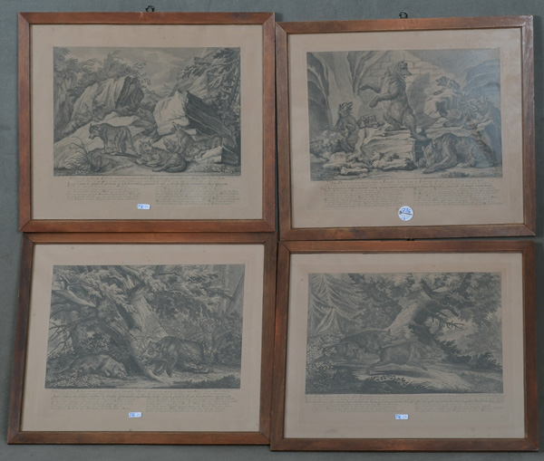 - Katalog-Nr: 236Johann Elias Ridinger (1698-1767). Wildschweine, Wölfe und Bären. Vier Kupferstiche, li./u./sign., hi./Gl. gerahmt, je 27 x 40 cm.o.L.