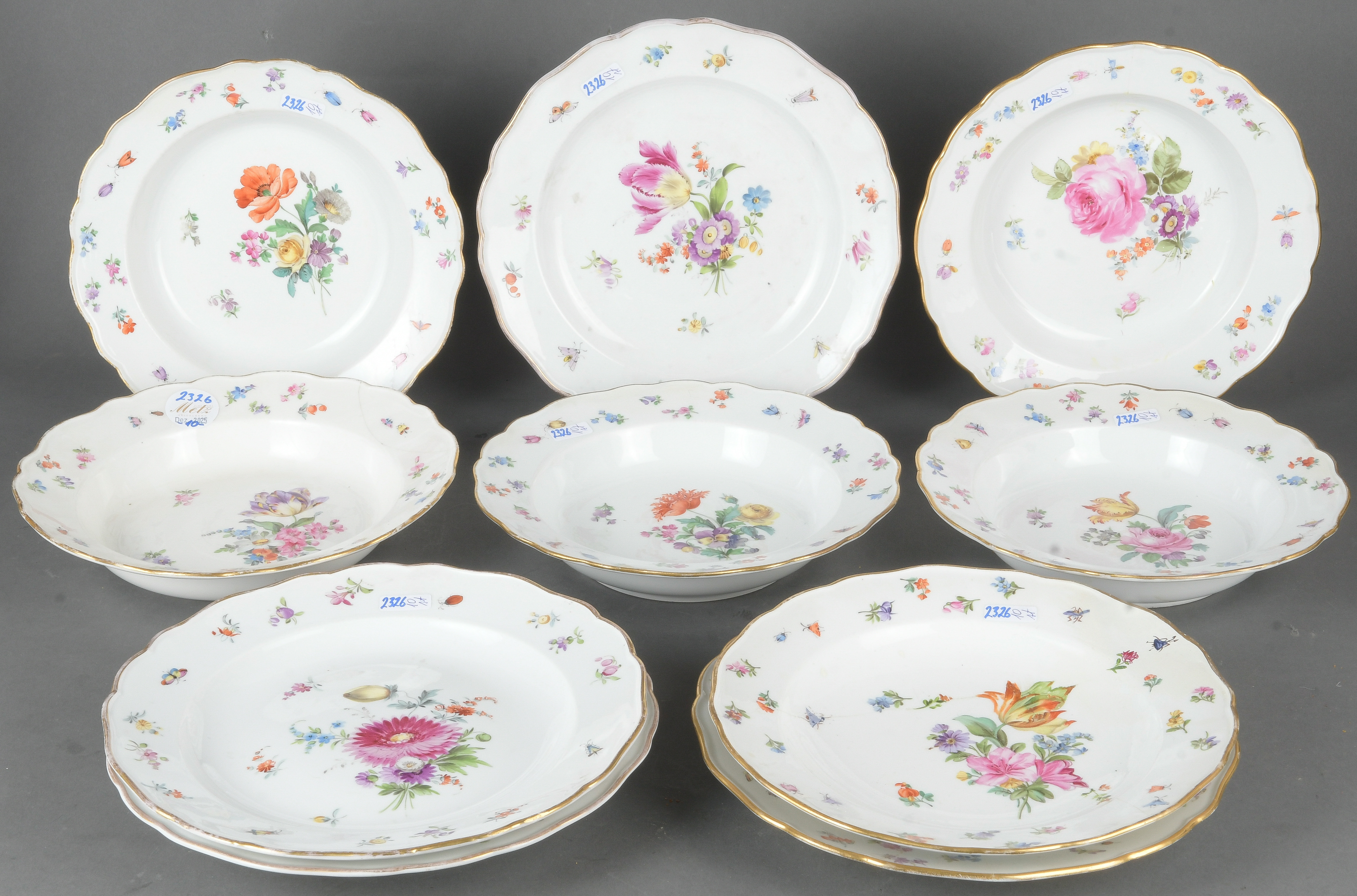 - Katalog-Nr: 2326Zehntlgs. Konvolut. Meissen 19./20. Jh. Porzellan, bunt bemalt mit Blumen und Insekten; am Boden unterglasurblaue Schwertermarke. Bestehend aus: Fünf Speiseteller (D=je 24,5 cm) und fünf Suppenteller (D=je 23,5 cm). (drei Stück besch. / zwei Stück rest.)o.L.