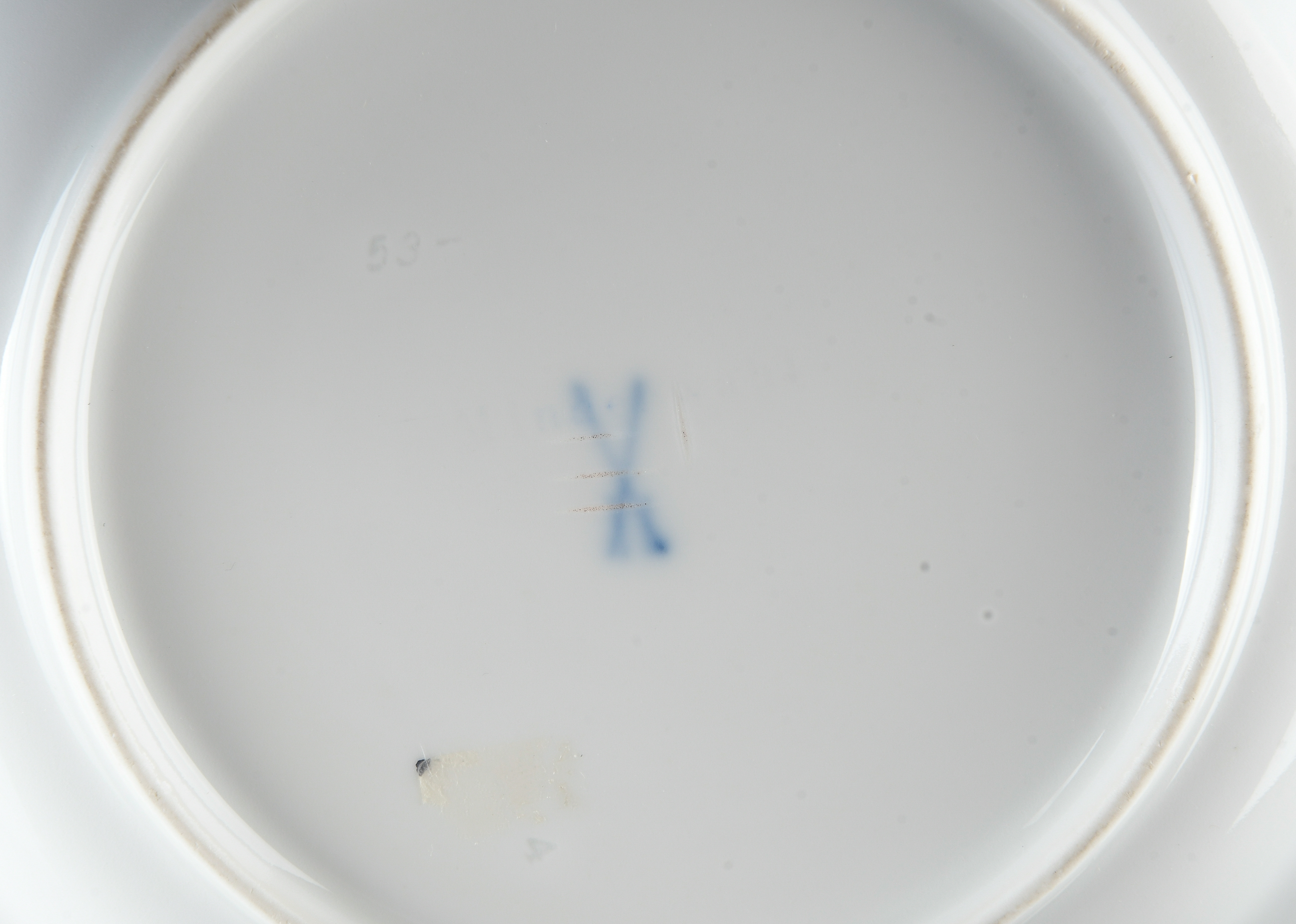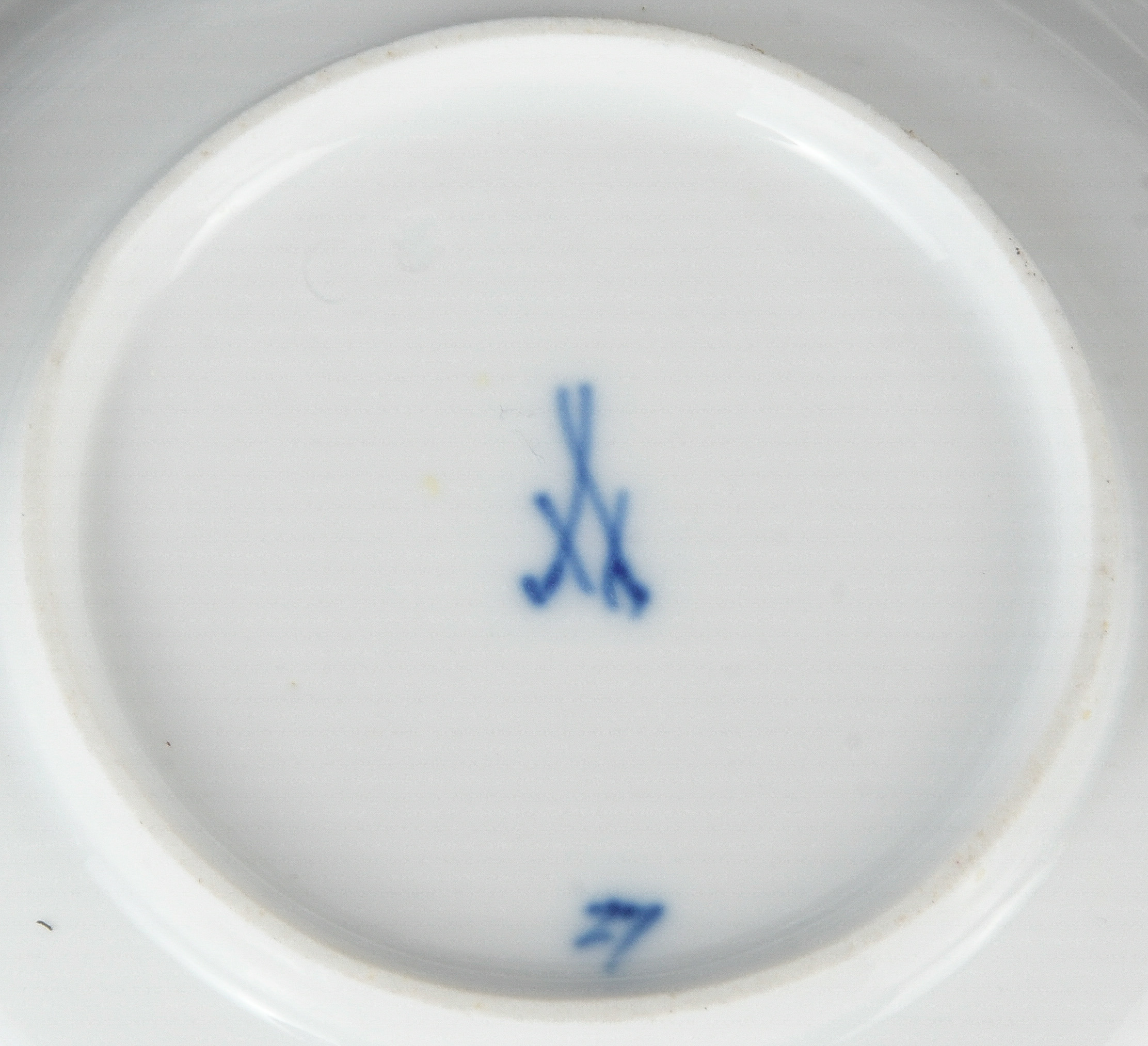 - Katalog-Nr: 234618 unterschiedliche Formteile „Zwiebelmuster“. Meissen 19./20. Jh. Porzellan, unterglasurblau bemalt, teilw. mit Goldrand; am Boden unterglasurblaue Schwertermarke, teilw. mit einem bis vier Schleifstrichen. Bestehend aus: Zwei Suppentassen mit Unterschalen, eine Doppelhenkelschale (H=9 cm, B=19,5 cm, T=24 cm), eine quadratische Schale (H=6 cm, B=19 cm), eine Vase (H=10,5 cm, D=9,5 cm), drei Aschenbecher (B=8 bis 19 cm), eine kleine Schale (D=11 cm), drei Schalen (D=17,5 cm), eine Deckeldose (H=9 cm, D=16 cm), zwei ovale Schalen (H=4 cm, B=19 cm, T=14,5 cm), eine Nierenschale (H=2,5 cm, B=21 cm, T=15 cm), ein Sieb (H=6 cm, D=20 cm) und eine Tintenfassplatte (H=2 cm, B=22 cm).o.L.