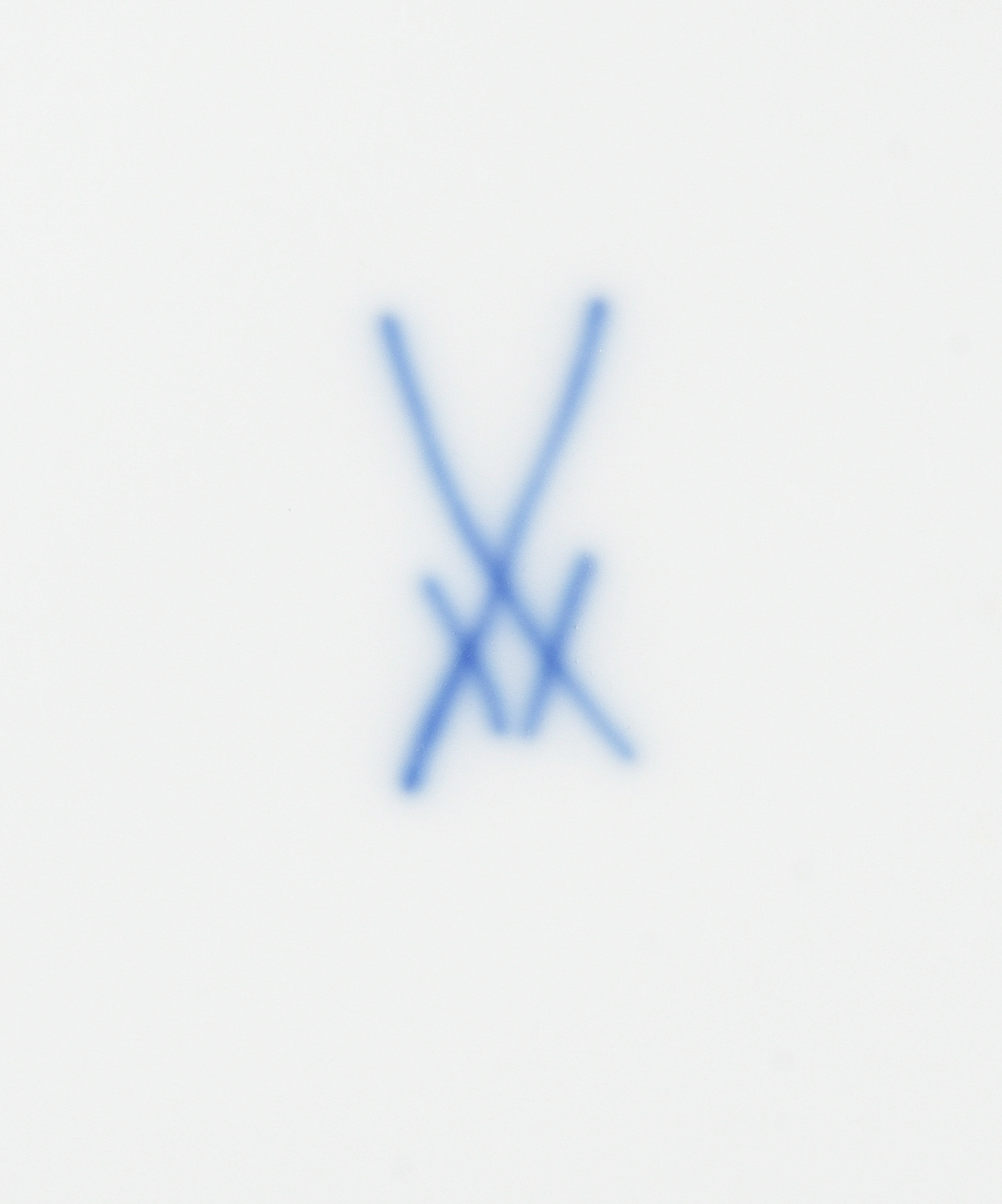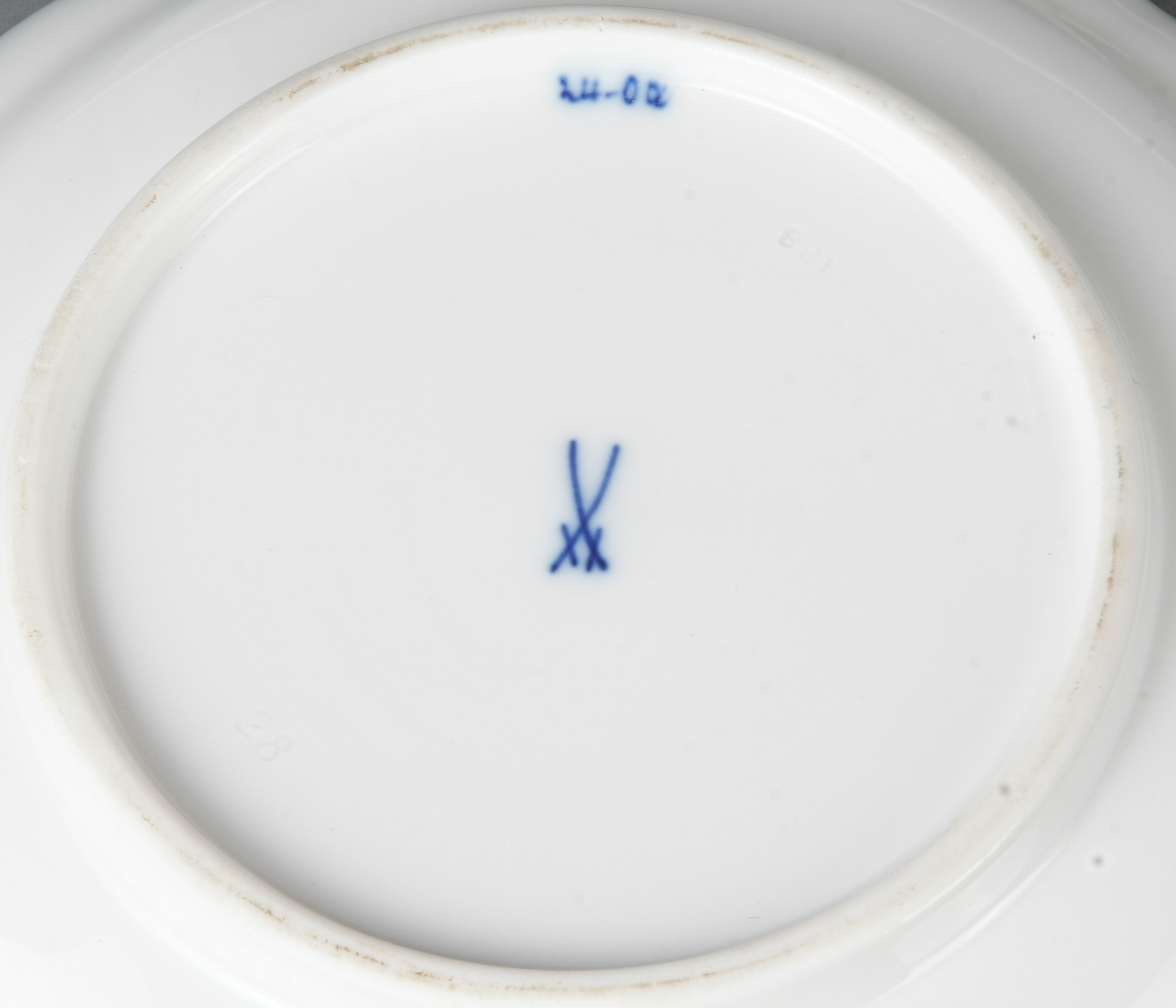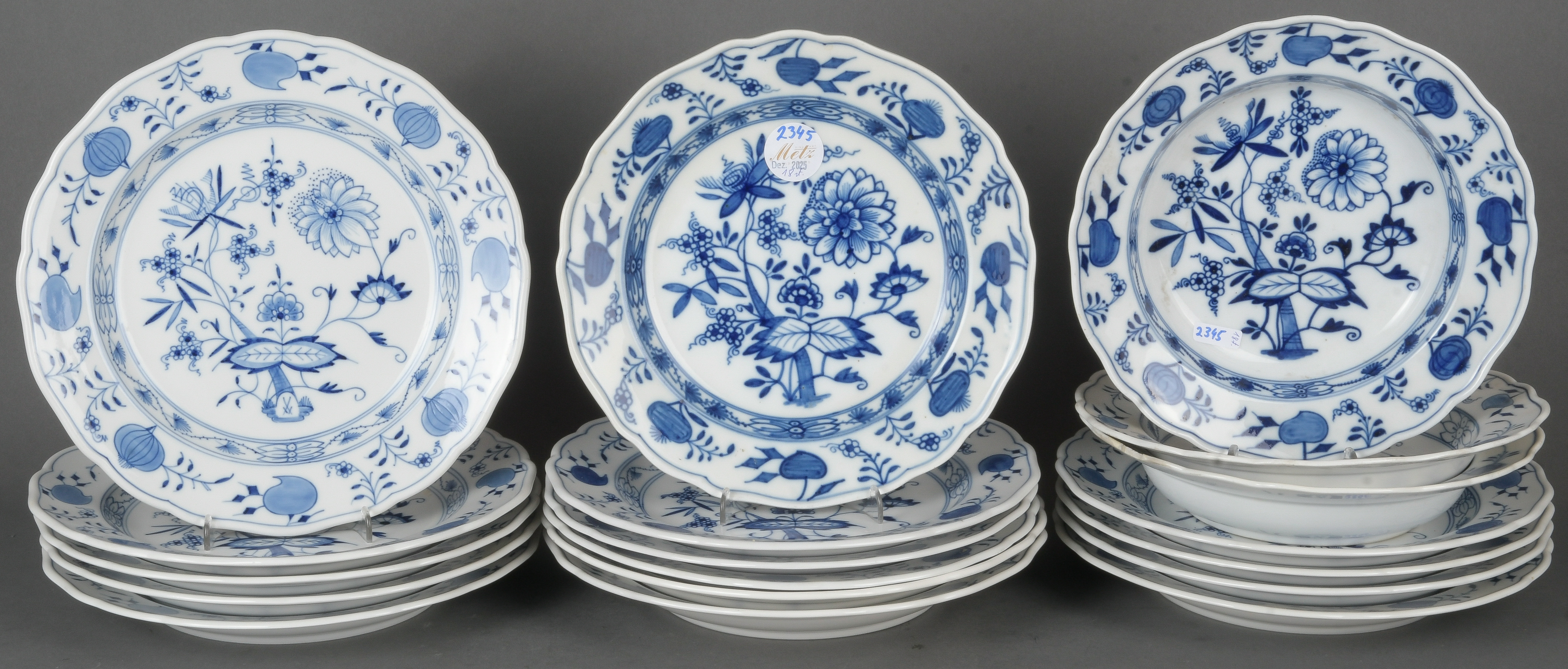 - Katalog-Nr: 234518 Teller „Zwiebelmuster“. Meissen 18. bis 20. Jh. Porzellan, unterglasurblau bemalt; am Boden unterglasurblaue Schwertermarke, teilw. mit einem bis drei Schleifstrichen. Bestehend aus: 15 Speiseteller (D=je 25,5 cm) und drei Suppenteller (D=je 24 cm).o.L.