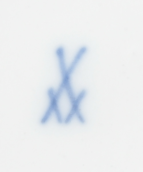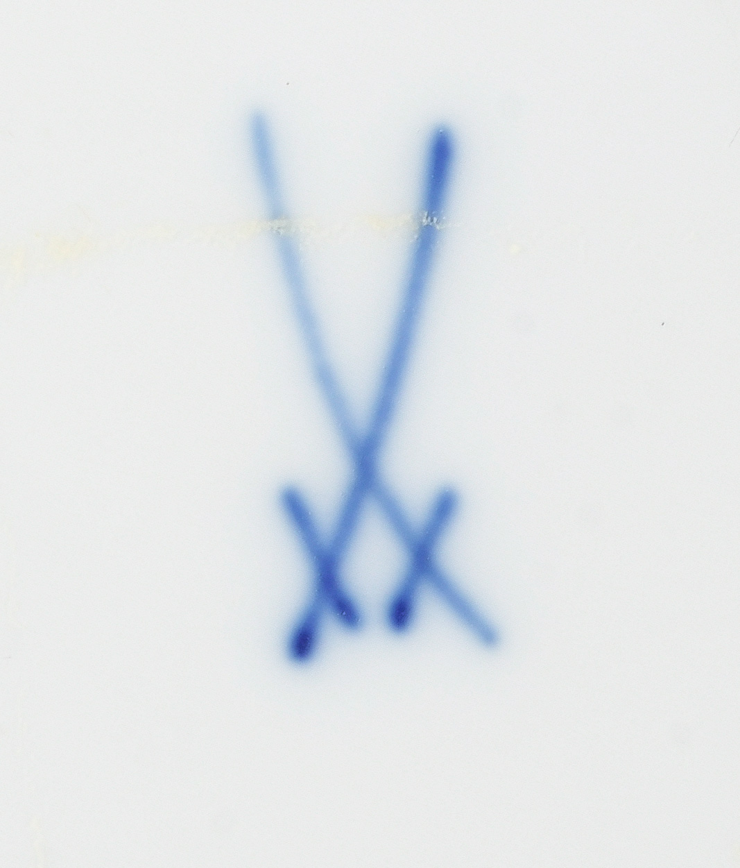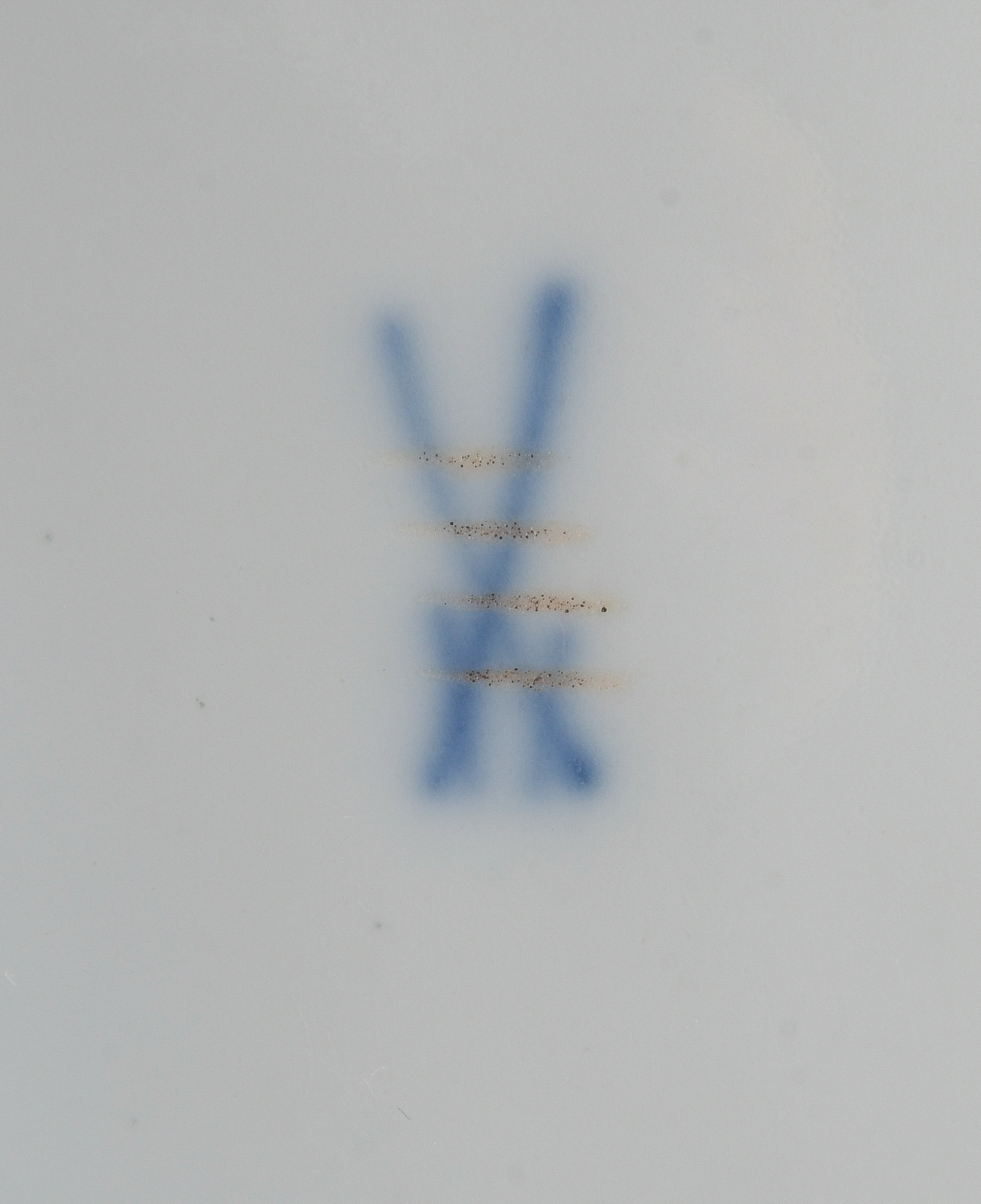 - Katalog-Nr: 234518 Teller „Zwiebelmuster“. Meissen 18. bis 20. Jh. Porzellan, unterglasurblau bemalt; am Boden unterglasurblaue Schwertermarke, teilw. mit einem bis drei Schleifstrichen. Bestehend aus: 15 Speiseteller (D=je 25,5 cm) und drei Suppenteller (D=je 24 cm).o.L.