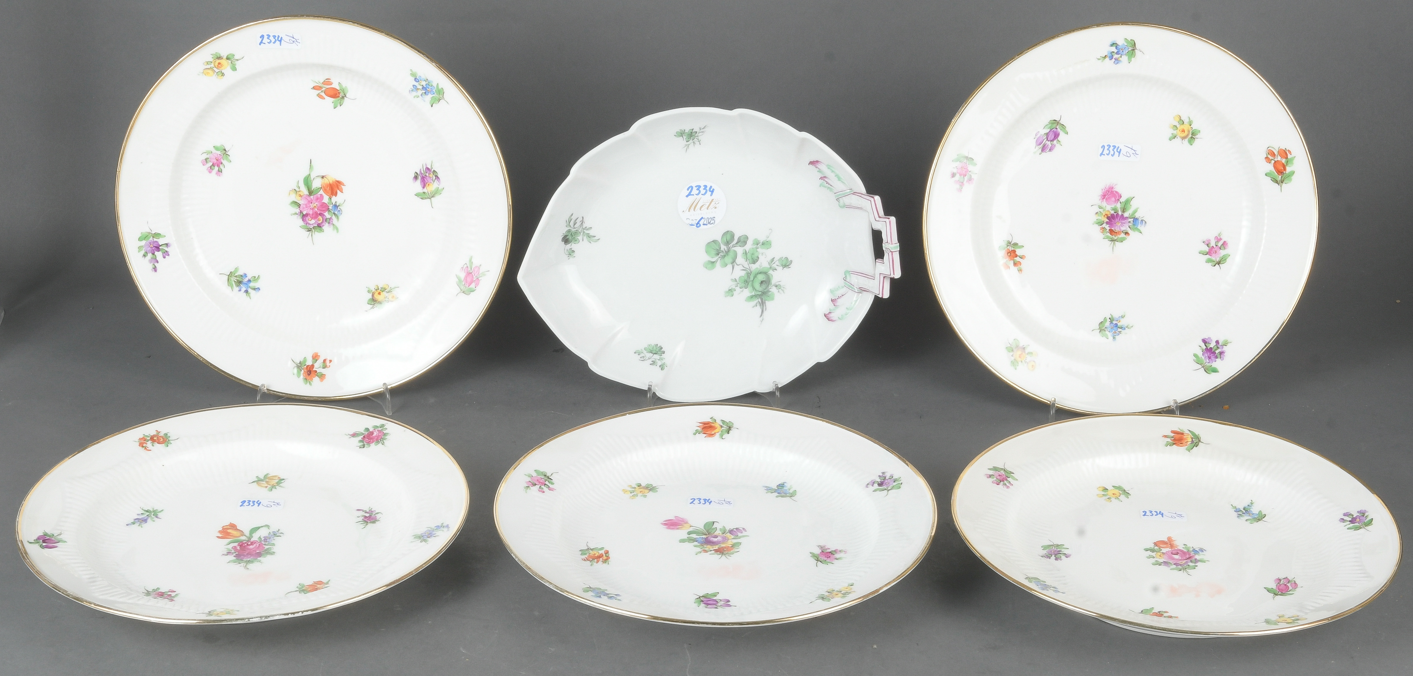 - Katalog-Nr: 2334Sechstlgs. Konvolut. Meissen 20. Jh. Porzellan, bunt bemalt; am Boden unterglasurblaue Schwertermarke. Bestehend aus: Fünf Speiseteller (D=je 23,5 cm) une eine Blattschale (H=5,5 cm, B=23 cm, T=18 cm).o.L.