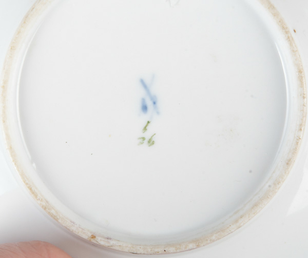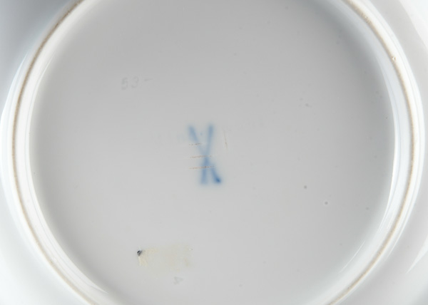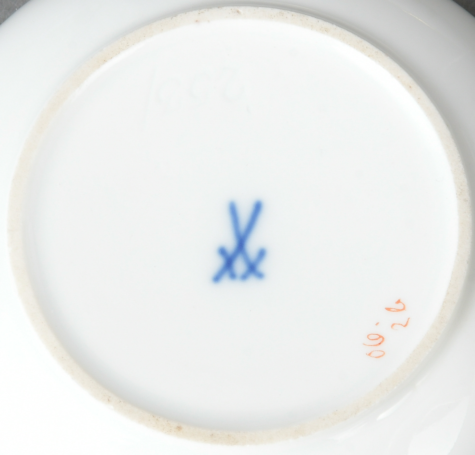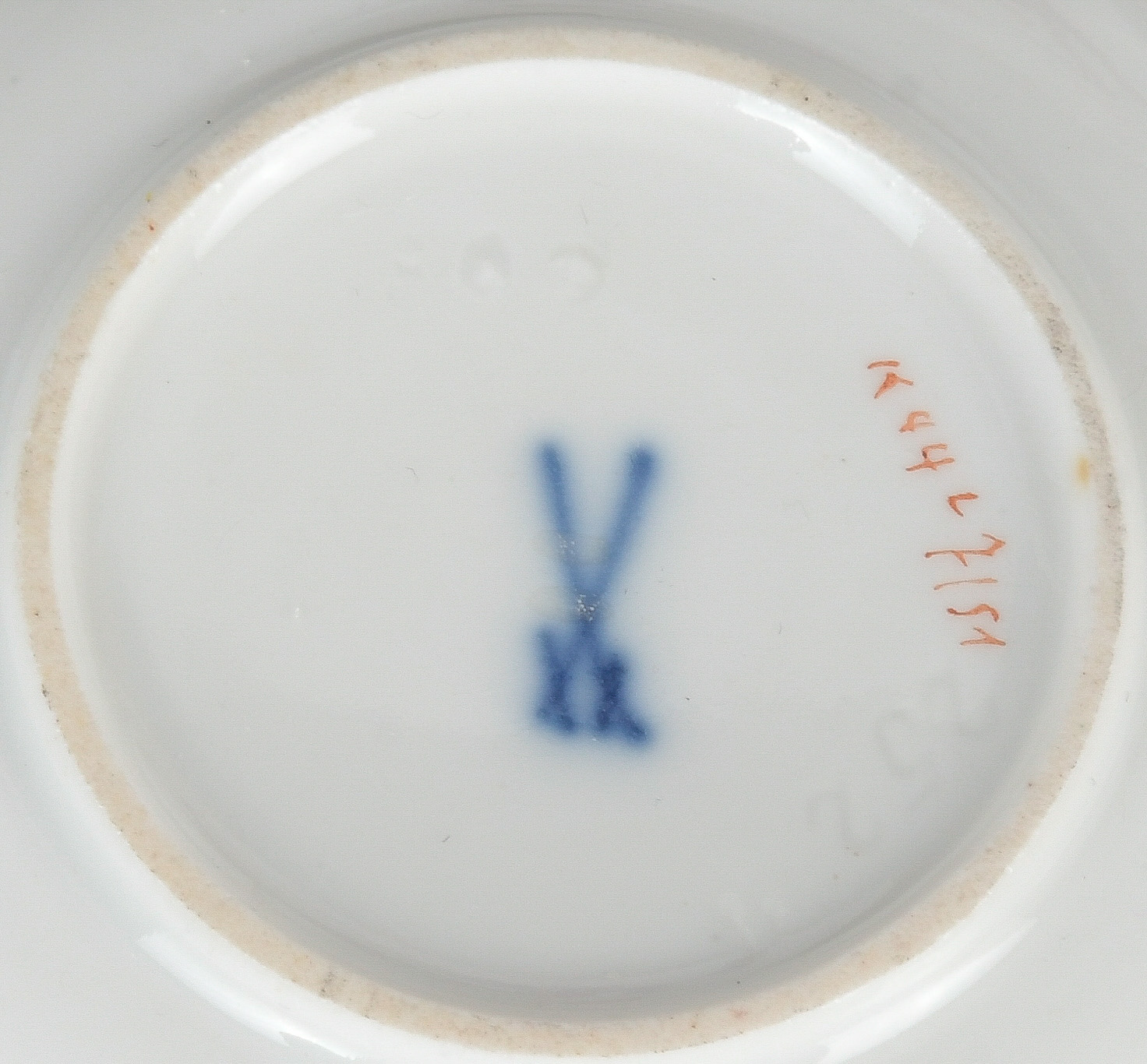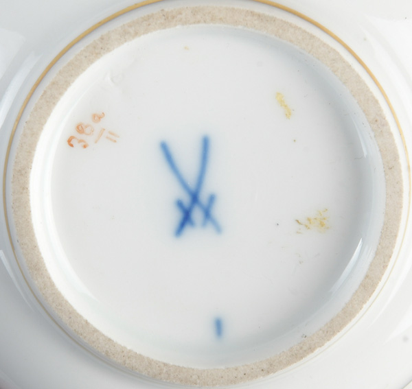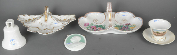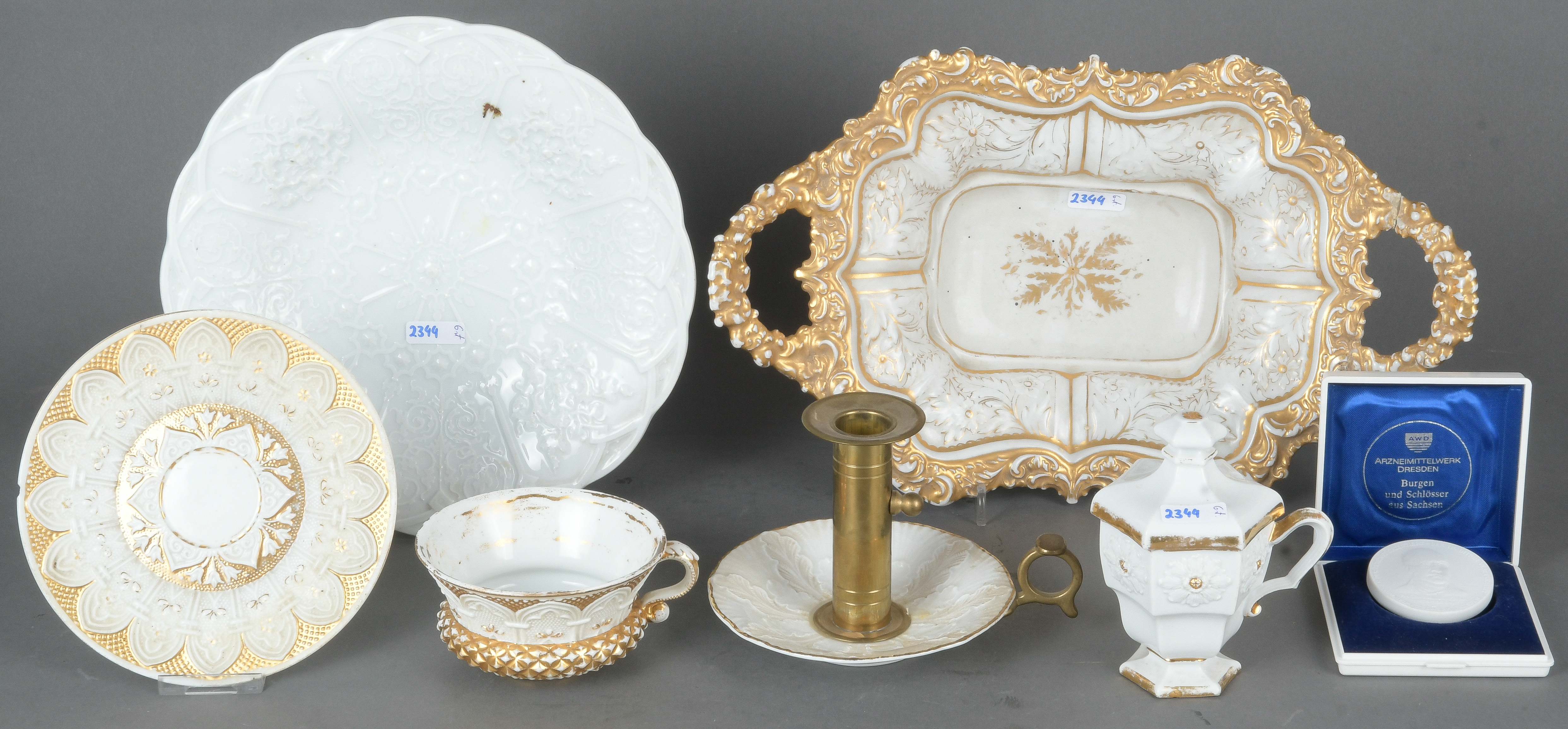 - Katalog-Nr: 2344Sechstlgs. Konvolut unterschiedlicher Formteile. Meissen 19./20. Jh. Porzellan, bunt bemalt und gold gehöht; verso unterglasurblaue Schwertermarke. Bestehend aus: Eine Prunkhenkelschale (H=8,5 cm, B=32,5 cm, T=19 cm), eine Deckeltasse, eine Prunktasse mit Unterschale, ein Kerzenleuchter (H=10 cm), eine Schale (D=22,5 cm) und eine Bisquitporzellan-Medaille (D=5 cm). (ein Teil rest.)o.L.