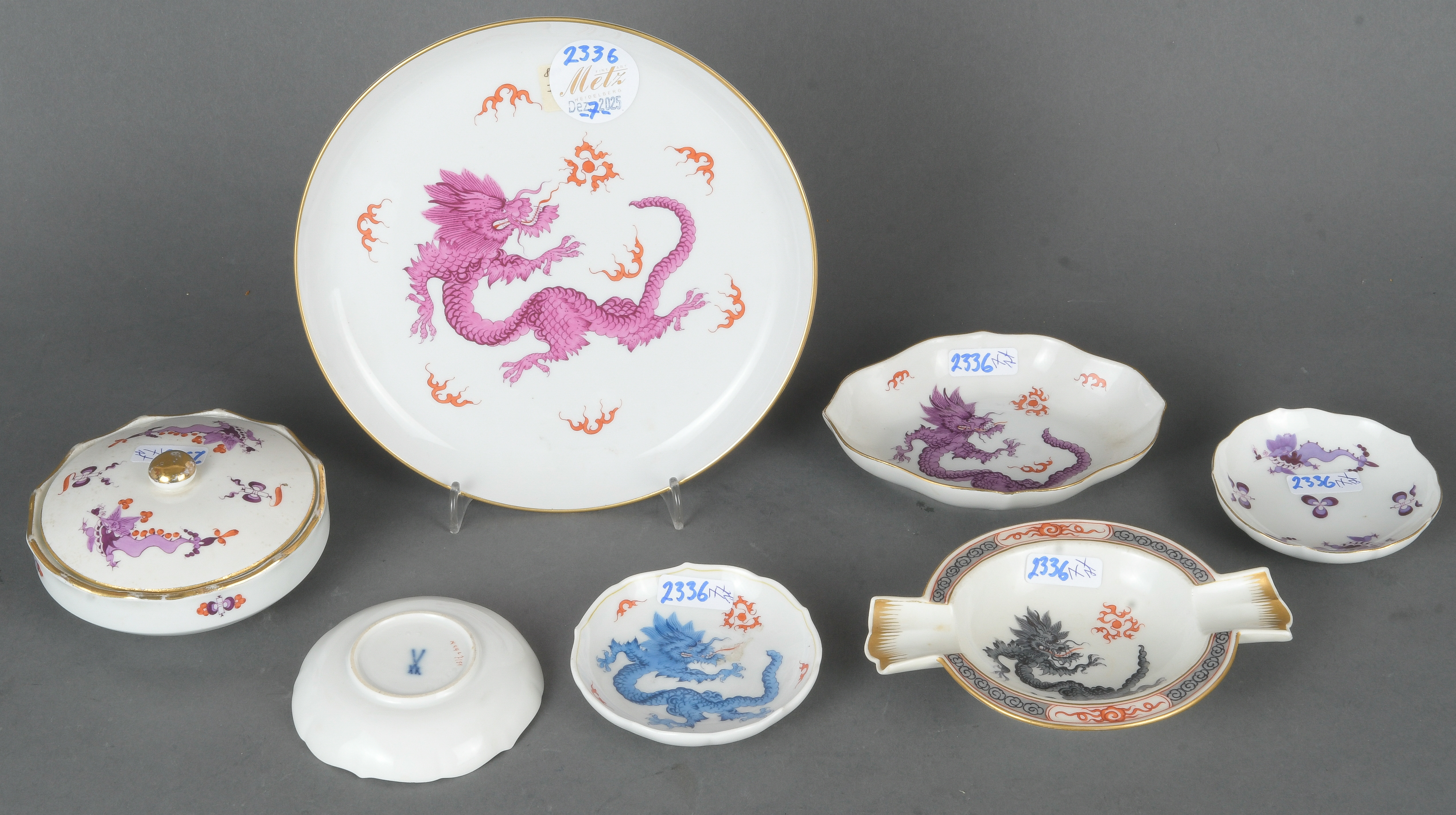 - Katalog-Nr: 2336Sieben unterschiedliche Formteile „Drachendekor“. Konvolut Meissen 20. Jh. Porzellan, bunt bemalt; am Boden unterglasurblaue Schwertermarke, teilw. mit einem bzw. zwei Schleifstrichen. Bestehend aus: Ein Aschenbecher (H=3 cm, B=14 cm, T=10 cm), eine Deckeldose (H=4,5 cm, D=10 cm), drei Gewürzschälchen (D=8 cm), eine ovale Schale (H=2,5 cm, B=12 cm, T=9 cm) und ein Teller (D=18 cm). (ein Teil best.)o.L.
