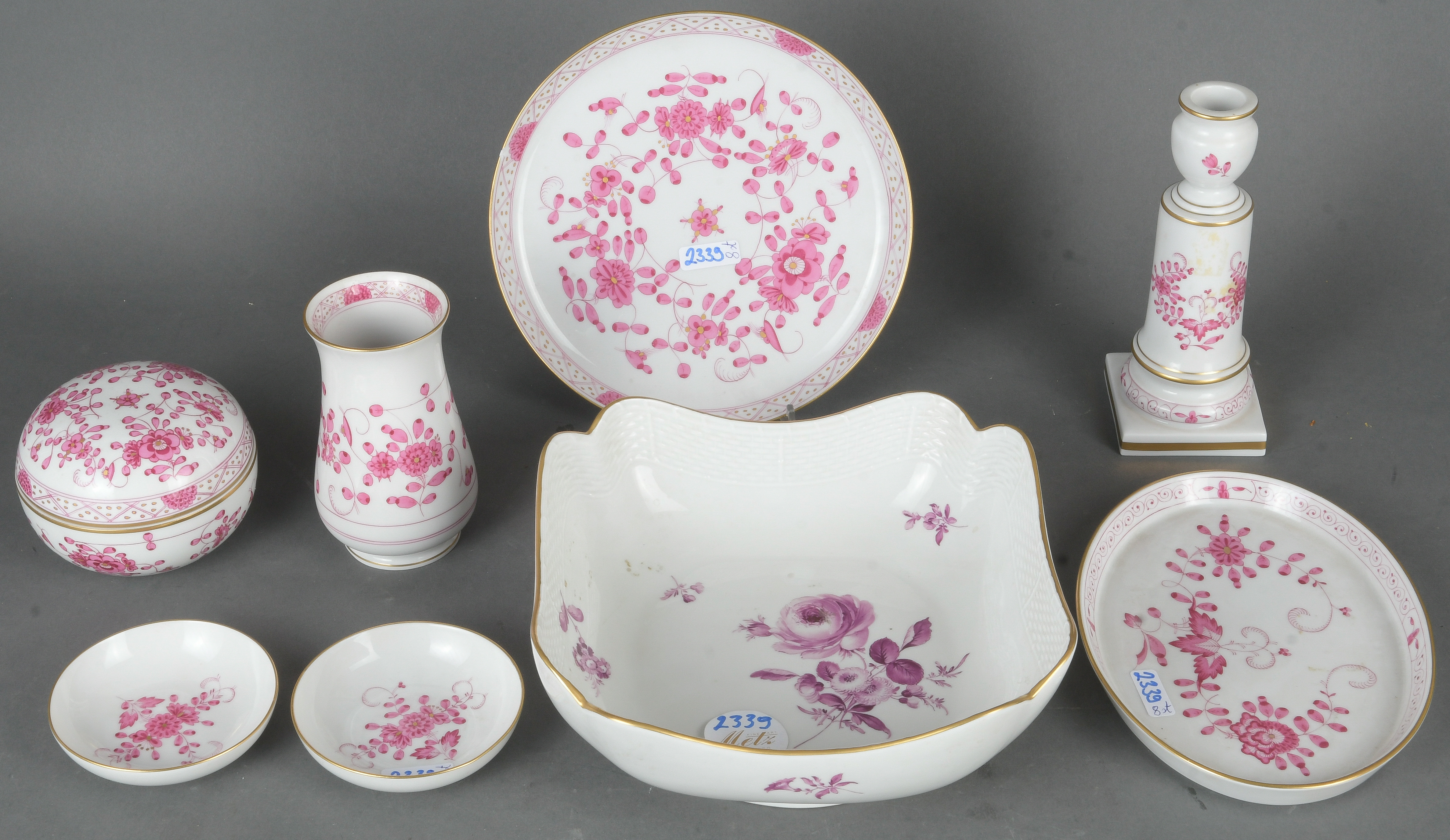 - Katalog-Nr: 2339Acht unterschiedliche Formteile „Indianische Blume Purpur“. Meissen 20. Jh. Porzellan, bunt bemalt; am Boden unterglasurblaue Schwertermarke. Bestehend aus: Ein Kerzenleuchter (H=15 cm), eine kleine Vase (H=11 cm), eine Deckeldose (H=6,5 cm, D=9 cm), eine runde Schale (H=2,5 cm, D=17,5 cm), eine quadratische Schale (H=7,5 cm, B=18 cm), zwei kleine Schälchen (D=8 cm), eine ovale Schale (H=2 cm, B=18 cm, T=13 cm). (ein Teil best.)o.L.