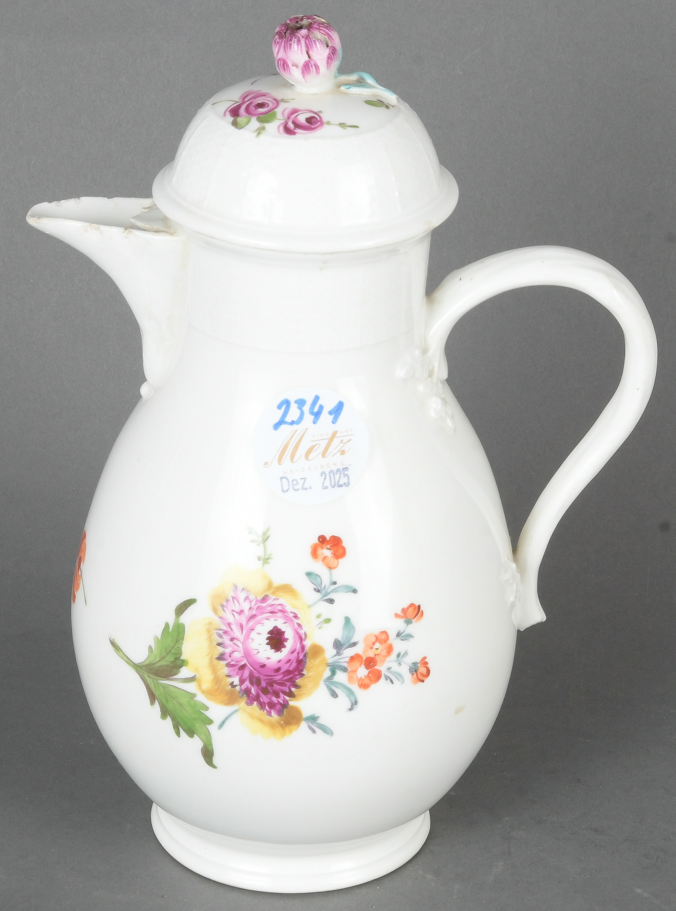 - Katalog-Nr: 2341Kaffeekanne. Meissen 18. Jh. Porzellan, bunt bemalt mit Blumendekor; am Boden unterglasurblaue Schwertermarke, H=23,5 cm. (best.)o.L.