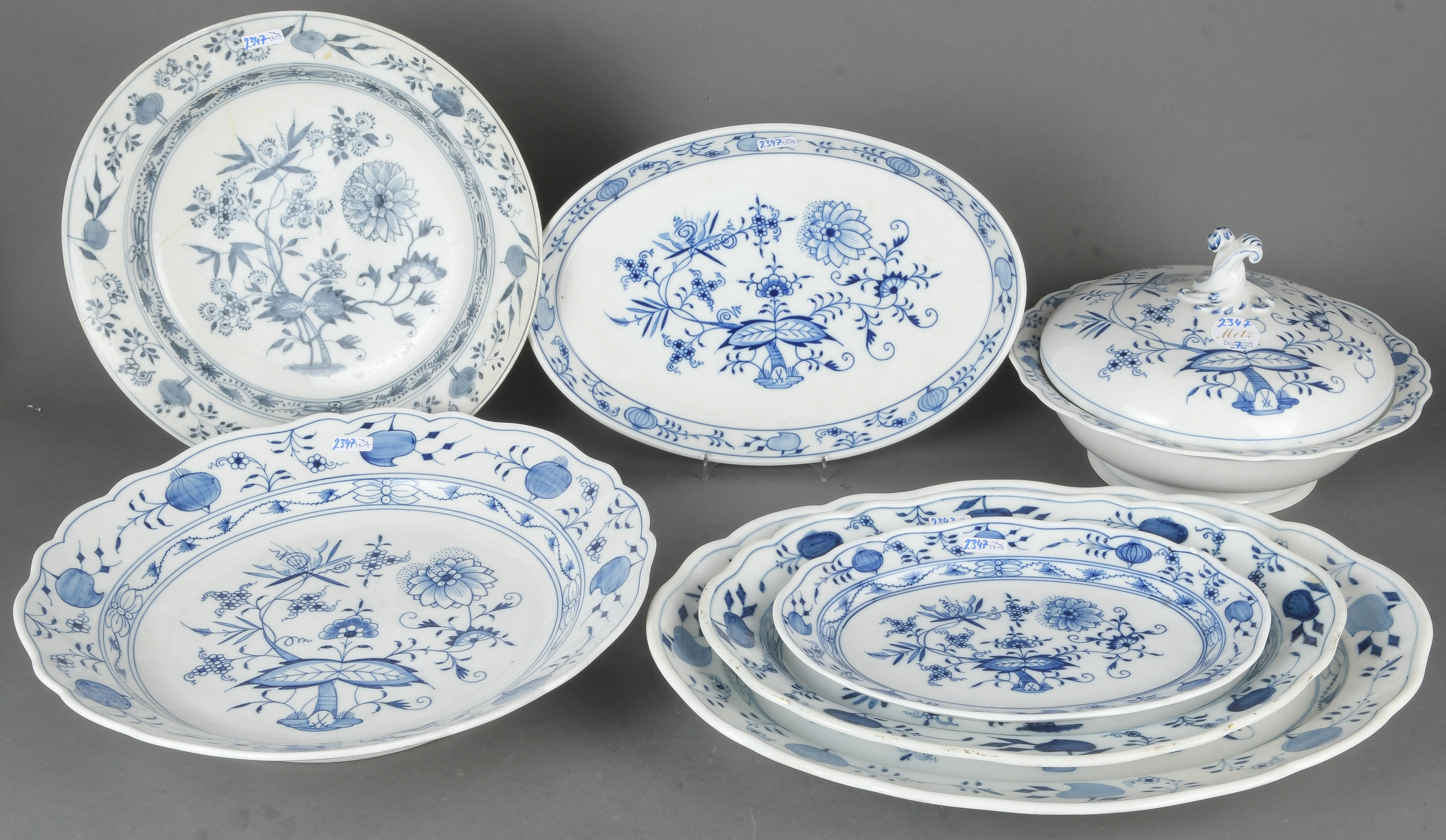 - Katalog-Nr: 2347Sieben unterschiedliche Formteile „Zwiebelmuster“. Meissen 18. bis 20. Jh. Porzellan, unterglasurblau bemalt, teilw. mit Goldrand; am Boden unterglasurblaue Schwertermarke, teilw. mit einem bis drei Schleifstrichen. Bestehend aus: Vier ovale Platten (H=3-5 cm, B=24,5-42 cm, T=19-30 cm), zwei Schalen (H=5 cm, D=30,5 cm / H=6 cm, D=35 cm) und eine Terrine (H=20 cm, D=26 cm). (rest.)o.L.