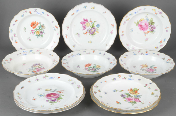 - Katalog-Nr: 2327Neuntlgs. Konvolut Meissen 19./20. Jh. Porzellan, bunt bemalt mit Blumen und Insekten, Goldrand; verso unterglasurblaue Schwertermarke, teilw. mit einem oder zwei Schleifstrichen. Bestehend aus: Fünf Speiseteller (D=22,5 bis 25 cm), zwei Suppenteller (D=je 23,5 cm), ein Beilageteller (D=18 cm), eine Schale (D=26,5 cm). (einer best. / einer rest.)o.L.