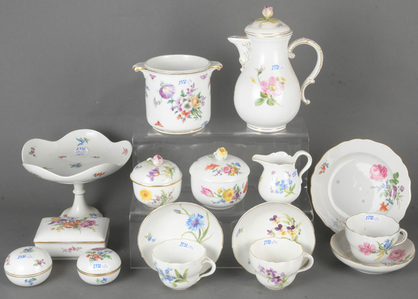 - Katalog-Nr: 2332Zwölftgs. Konvolut Porzellan, u.a. „Streublumen“. Meissen 19./20. Jh. Porzellan, bemalt bemalt; am Boden unterglasurblaue Schwertermarke, teilw. mit einem bzw. zwei Schleifstrichen. Bestehend aus: Eine Kaffeekanne (H=21 cm), ein Milchgießer (H=9 cm), zwei Zuckerdosen (H=8 / 10 cm), zwei Tassen mit Unterschalen, ein Gedeck (Teller: D=18 cm), zwei Deckeldosen (H=5 cm, D=7 / 7,5 cm), eine Deckeldose (H=4,5 cm, B=12 cm, T=8,5 cm), ein Tafelaufsatz (H=14,5 cm, D=20 cm) und ein Cachepot (H=11,5 cm).o.L.