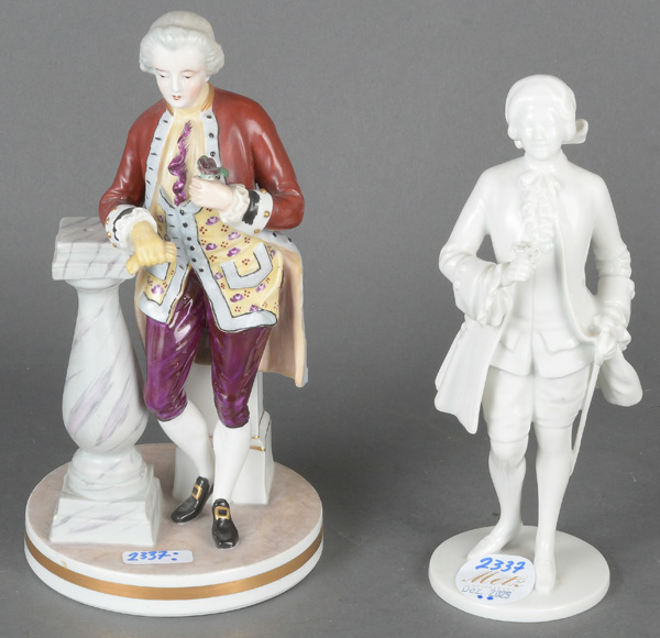 - Katalog-Nr: 2337Zwei Figuren galanter Herren. Augarten / Sitzendorf 20. Jh. Porzellan, bunt bemalt / weiß glasiert; am Boden gemarkt, H=20,5 / 22 cm.o.L.