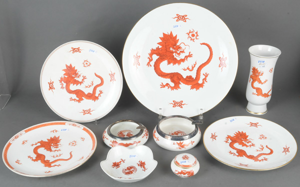 - Katalog-Nr: 2338Neun unterschiedliche Formteile „Roter Drachendekor“. Konvolut Meissen 19./20. Jh. Porzellan, bunt bemalt; am Boden unterglasurblaue Schwertermarke, teilw. mit einem bis drei Schleifstriche. Bestehend aus: Zwei Aschenbecher mit Silberrand (D=13 / 14 cm), eine Deckeldose (H=4,5 cm, D=7 cm), eine Blattschale (H=4 cm, D=14 cm), drei Teller (D=25 cm), eine Platte (D=35 cm) und eine Vase (H=20,5 cm). (ein Teil besch.)o.L.
