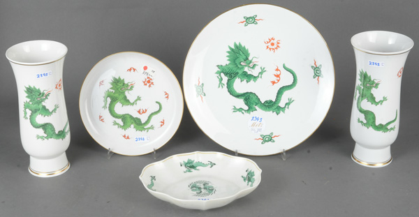 - Katalog-Nr: 2343Fünf unterschiedliche Formteile „Grüner Drachendekor“. Meissen 20. Jh. Porzellan, bunt bemalt; am Boden unterglasurblaue Schwertermarke, teilw. mit einem bzw. zwei Schleifstrichen. Bestehend aus: Eine ovale Schale (H=3,5 cm, B=19 cm, T=15,5 cm), ein Teller (D=25 cm), ein kleiner Teller (D=18 cm) und zwei Vasen (H=je 21 cm). (ein Teil min. best.)o.L.