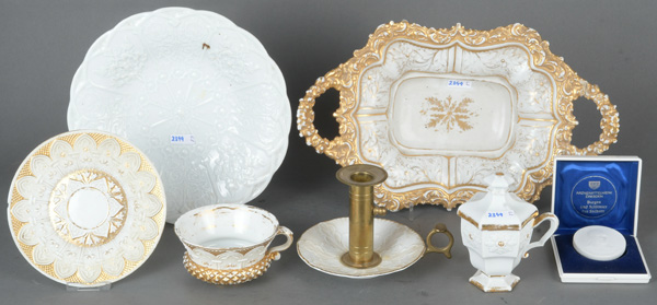 - Katalog-Nr: 2349Fünf unterschiedliche Formteile, u.a. Berlin 19./20. Jh. Porzellan, weiß glasiert, teilw. gold gehöht; meist am Boden unterglasurblaue Szeptermarke, teilw. mit EK. Bestehend aus: Zwei Anbietschalen, eine Glocke, eine Plakette und eine Tasse mit Unterschale, H=9 bis 12 cm.o.L.
