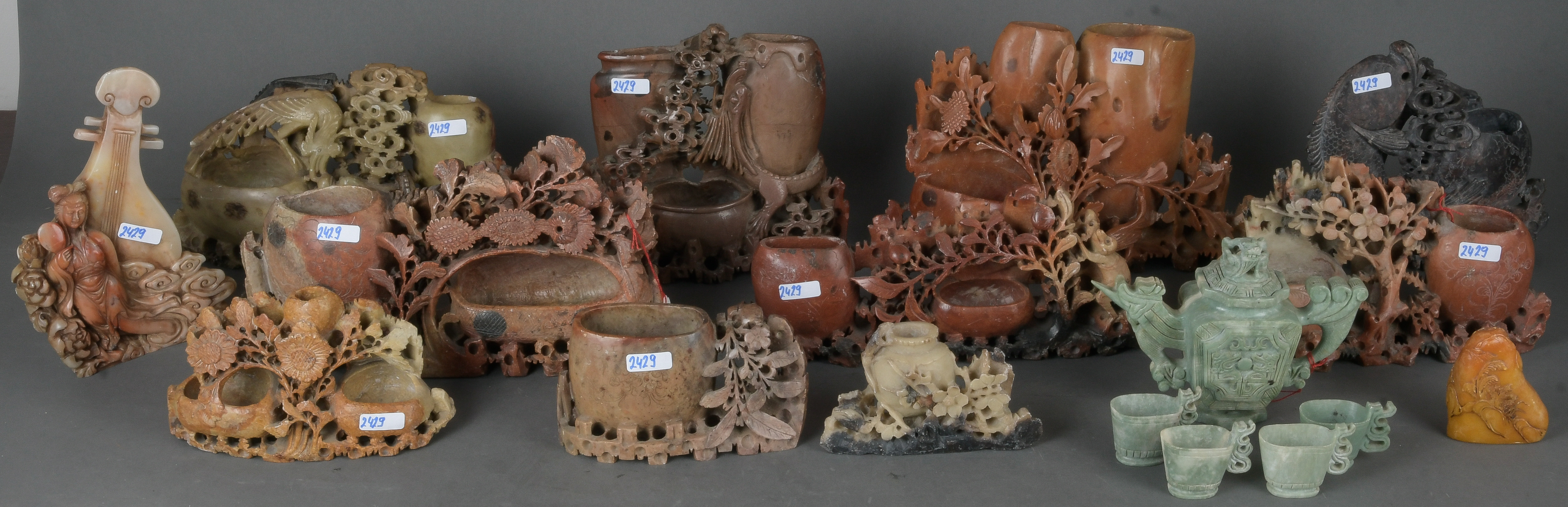 - Katalog-Nr: 242913-tlgs. Konvolut Asiatika: Zehn Pinselbecher, zwei Siegelstempel und eine Kanne mit vier Koppchen im Etui, H=7,5 bis 17 cm.o.L.