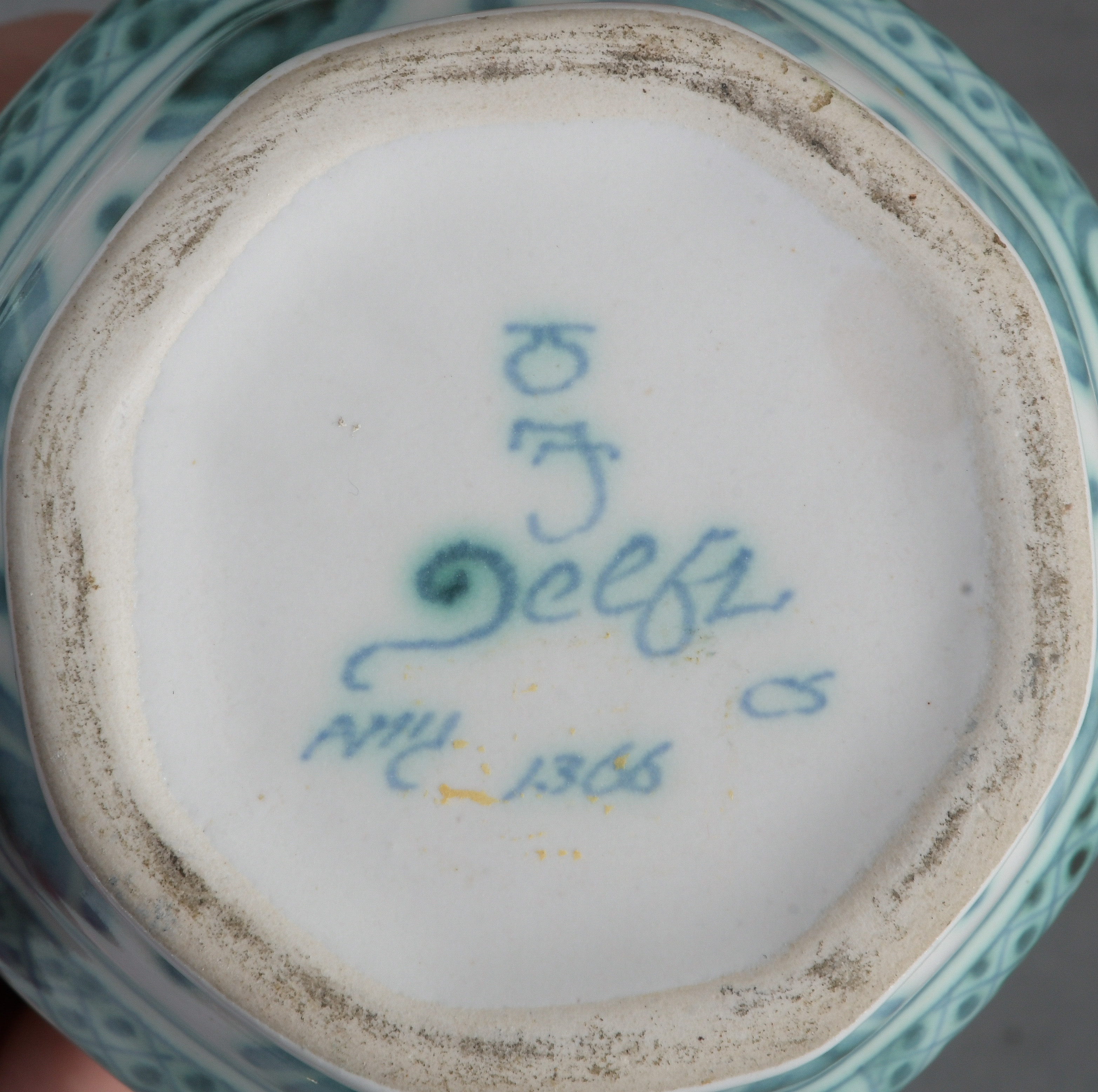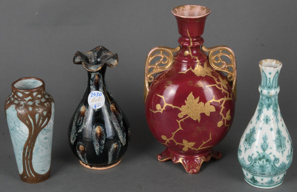 - Katalog-Nr: 2430Vier Vasen, u.a. Bonn / Delft 20. Jh. Keramik, mit Schmelzglasur bzw. bunt bemalt und gold gehöht, H=17 bis 27,5 cm. (best.)o.L.