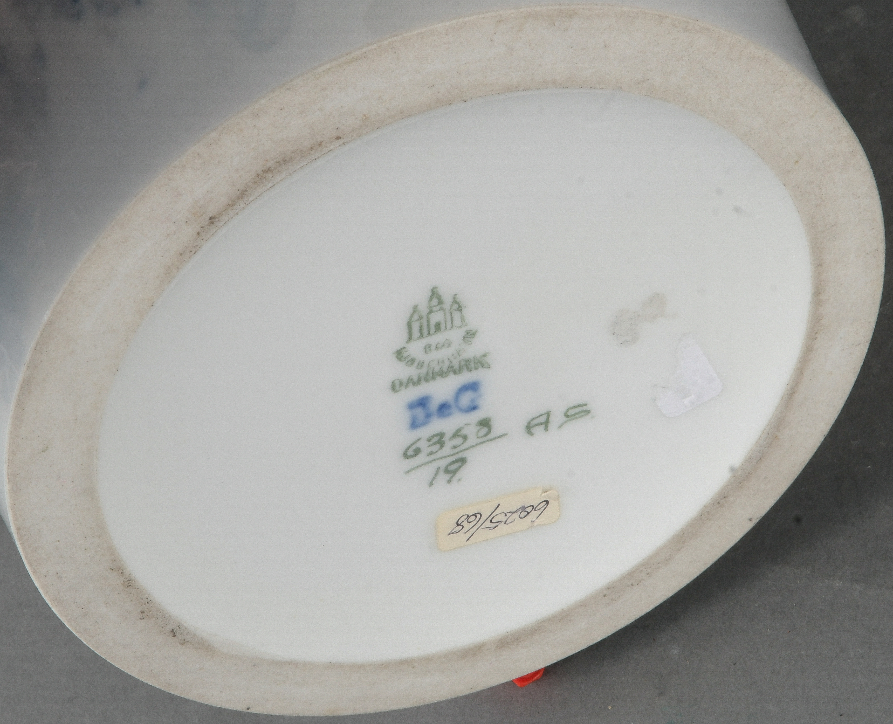 - Katalog-Nr: 2432Große Vase. Bing & Grøndahl 20. Jh. Porzellan, bunt bemalt mit Uferlandschaft und Segelbooten; am Boden gemarkt mit Ziffer „6353“ und monogr. „AS“, H=41 cm.o.L.