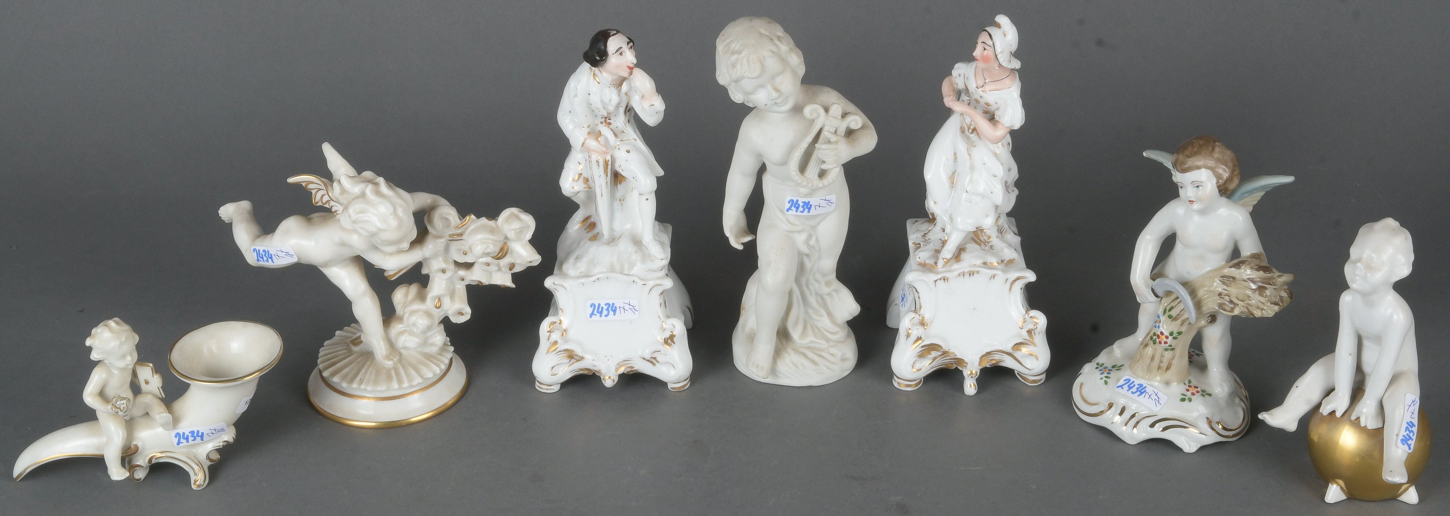 - Katalog-Nr: 2434Drei Figuren und vier Putten, u.a. Böhmen / Hutschenreuther / Metzler & Ortloff 20. Jh. Porzellan, weiß glasiert und gold gehöht; am Boden gemarkt, H=8,5 bis 19,5 cm. (besch.)o.L.