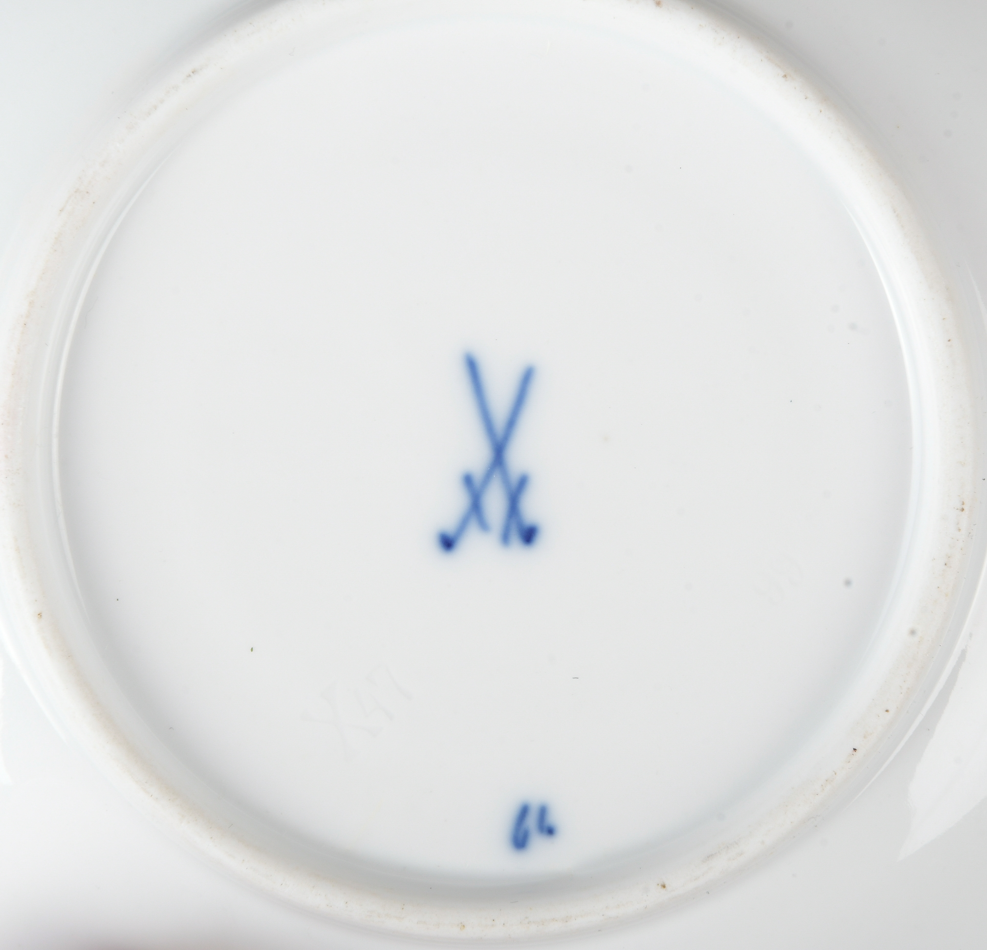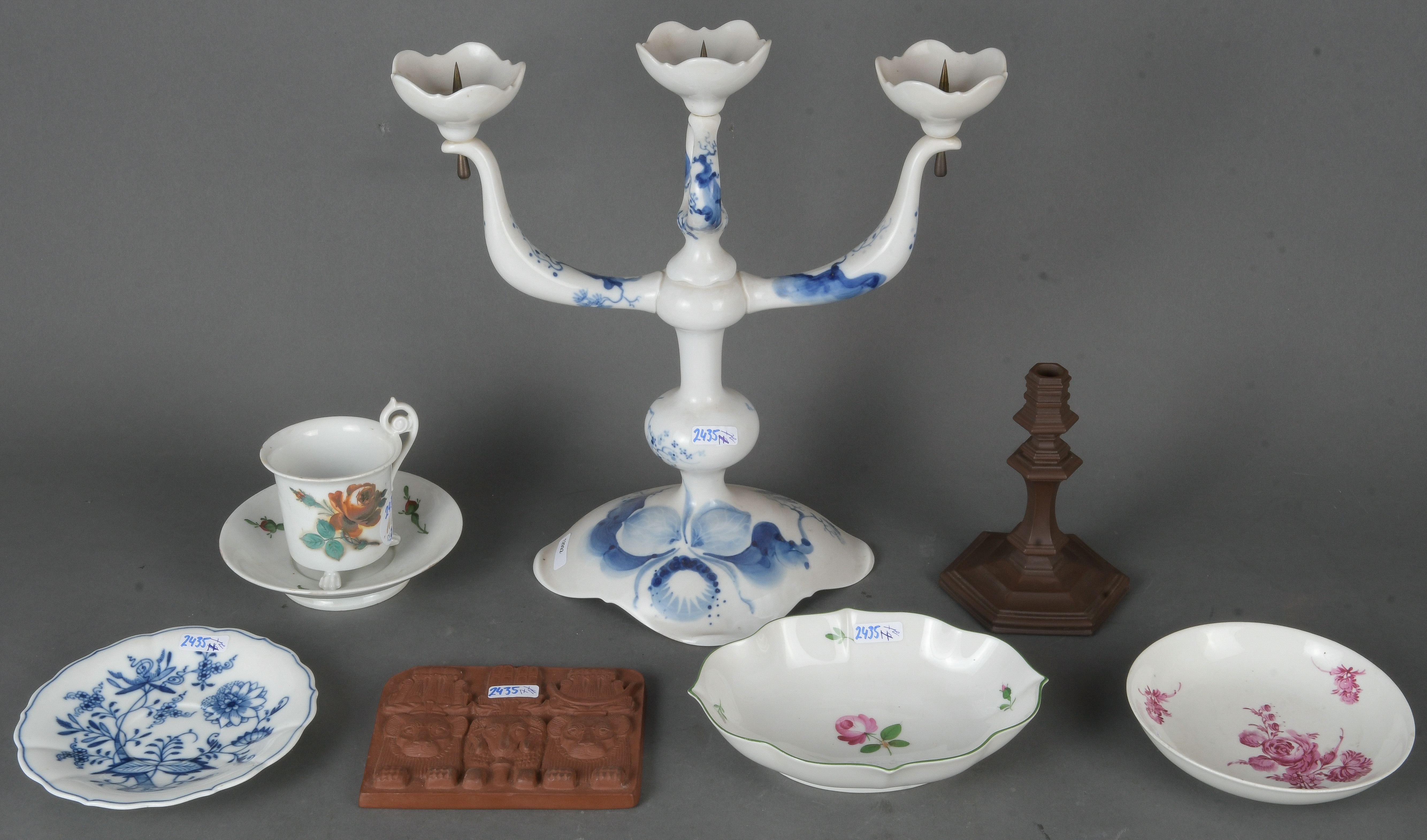 - Katalog-Nr: 2435Siebentlgs. Konvolut Porzellan aus unterschiedlichen Manufakturen, 19./20. Jh., bunt bemalt mit Floraldekor bzw. unterglasurblau bemalt mit Zwiebelmuster: Eine Unterschale, Wien (D=13,5 cm); eine ovale Schale, Wien-Augarten (H=3,5 cm, B=16 cm, T=13 cm), eine Tasse mit Unterschale sowie eine Unterschale, Meissen (D=14,5 cm), eine Girandole, Meissen (H=31 cm) sowie eine Plakette (10 x 13 cm) und ein Kerzenleuchter (H=14 cm) jeweils Böttgerporzellan, Meissen.o.L.