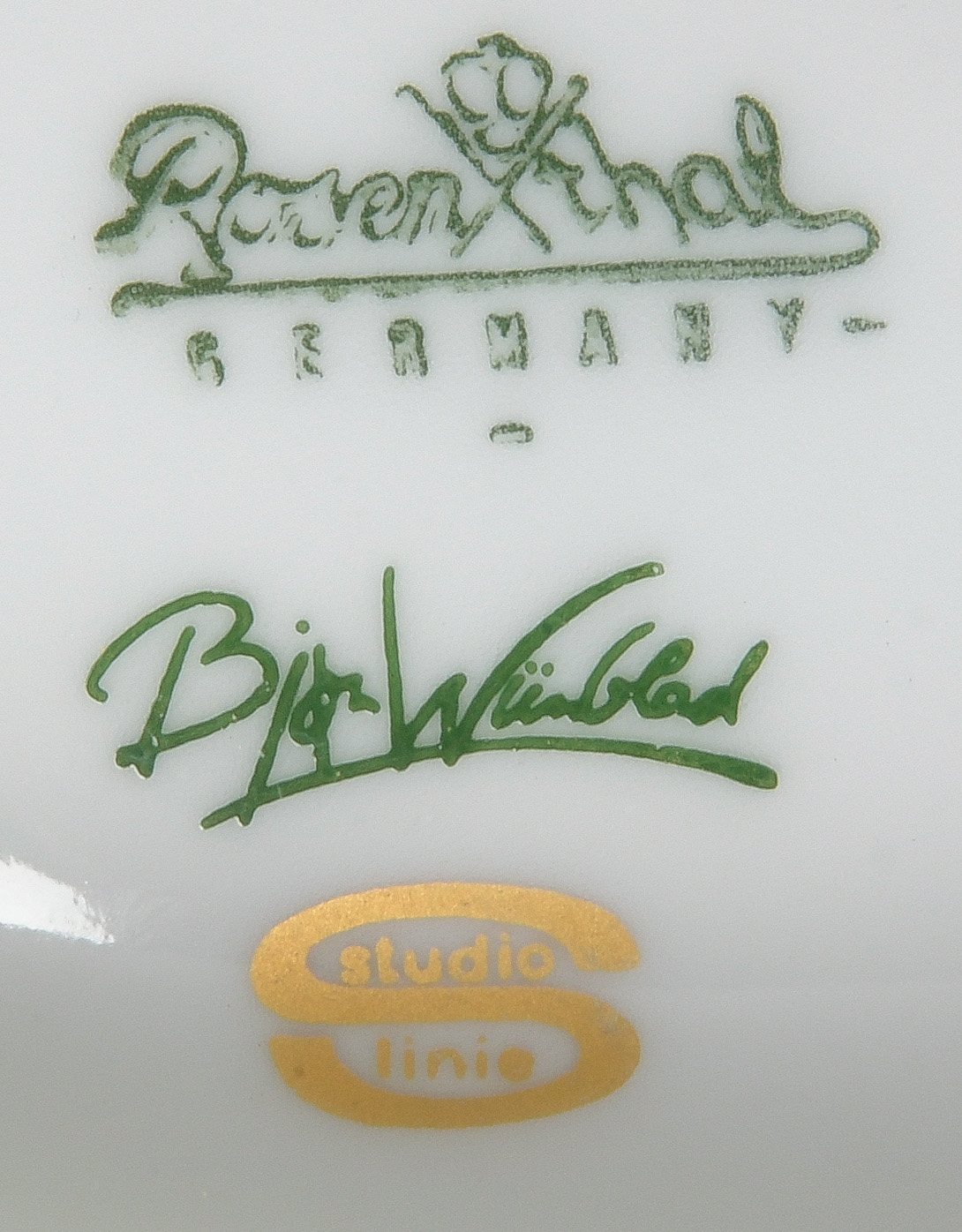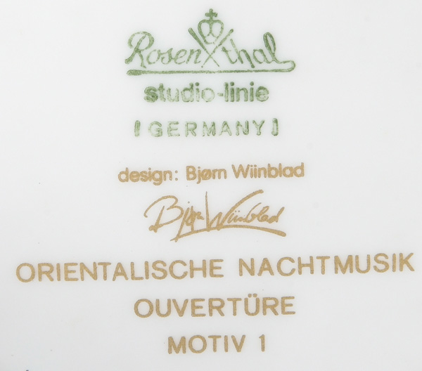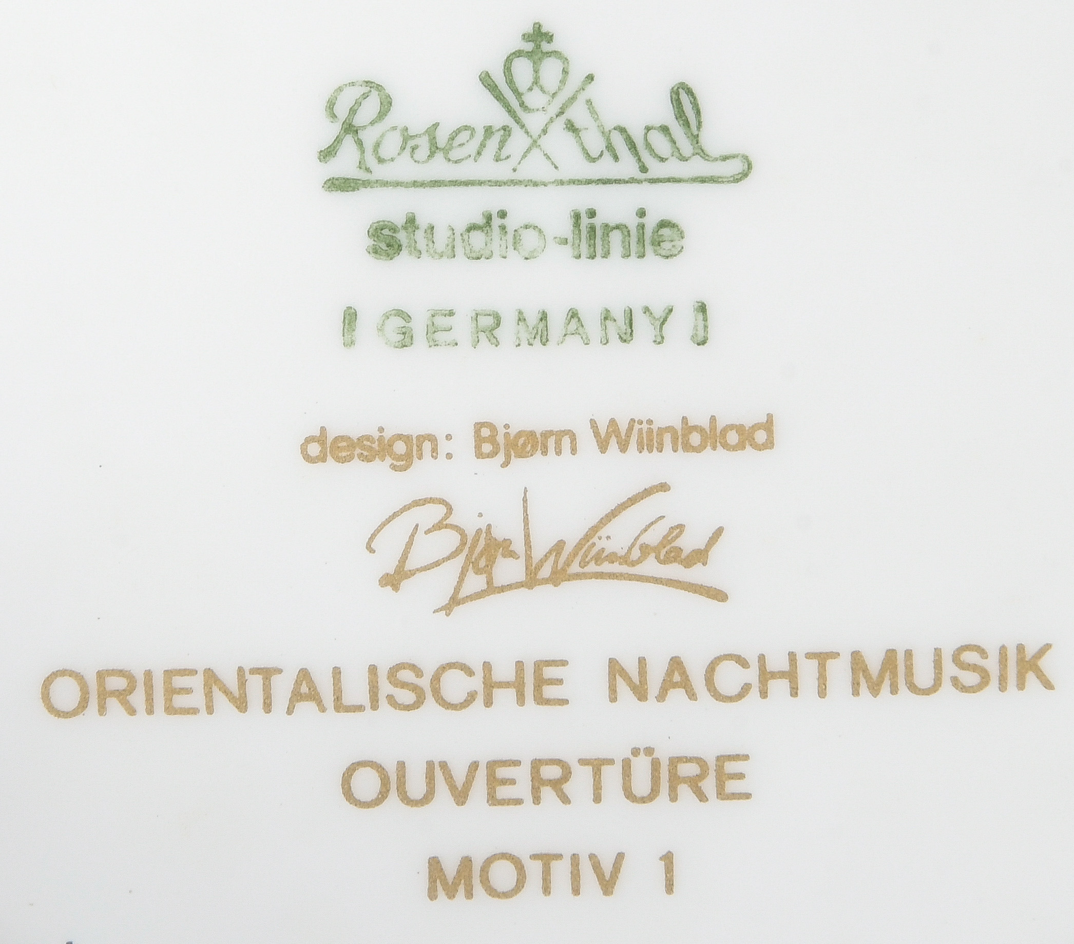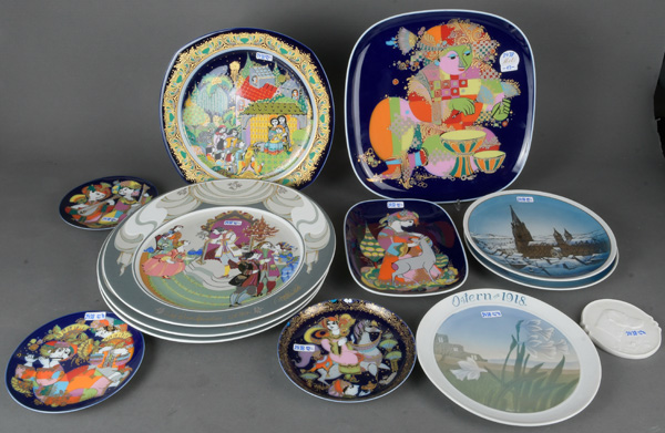 - Katalog-Nr: 243813-tlgs. Konvolut Rosenthal. Porzellan, bunt bemalt, meist Entwurf Björn Wiinblad: Ein Wandteller „Aladin und die Wunderlampe IX“ (D=16 cm), ein Wandteller „Orientalische Nachtmusik“ (D=15 cm), eine Platte „1001 Nacht“ (H=3 cm, B=22 cm, T=17 cm), ein Osterteller 1918 (D=21 cm), zwei Weihnachtsteller 1974 / 1975 (D=je 22 cm), ein Weihnachtsteller 1983 (D=27,3 cm), drei Teller „Rosenkavalier“ (D=je 31 cm), eine Platte „Trommelspieler“ (H=5 cm, B=30 cm) und eine Ehrenplakette „Deutsch Drahthaar“. (ein Teil besch.)o.L.