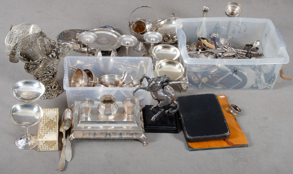 - Katalog-Nr: 2431Großes Konvolut Silber, ca. 8.000 g. Bestehend aus: Besteckteile, Pferdefigur, Champagner-/Eiskelche, Tintenzeug, Doppelhenkelschalen, Tablett, Durchbruchskörbchen, Vase, Gewürzstreuer, Kerzenleuchter, Becher u.a.m.o.L.