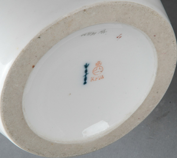 - Katalog-Nr: 2439Sechs unterschiedliche Formteile. Berlin 20. Jh. Porzellan, meist bunt bemalt mit Blattdekor; am Boden unterglasurblaue Szeptermarke. Bestehend aus: Eine kleine Henkelschale (H=3,5 cm, D=13 cm), eine kleine Schale (D=10,5 cm) und vier unterschiedliche Vasen (H=13 bis 39 cm).o.L.