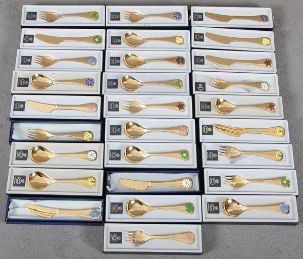 - Katalog-Nr: 2447Konvolut Besteckteile mit Email-Blumendekor. Dänemark, Georg Jensen 20. Jh. Silber, ca. 1.250 g, vergoldet. Bestehend aus: Acht Messer, neun Gabeln und elf Löffel, jeweils in Original-Etui.o.L.
