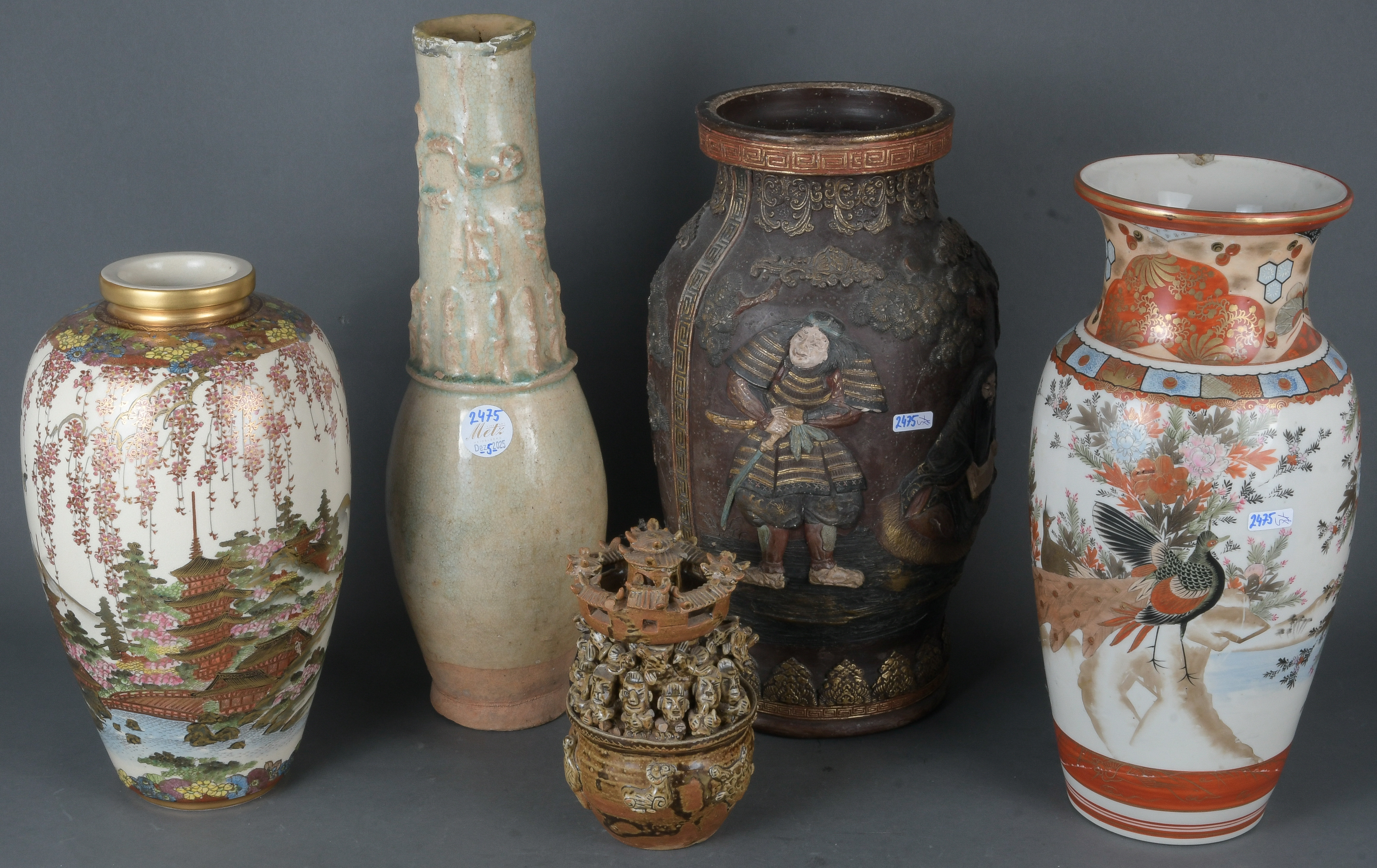 - Katalog-Nr: 2475Fünf Vasen. Asien. Keramik / Porzellan, bunt bemalt, teilw. mit aufbossiertem Dekor, H=18 bis 42 cm. (besch.)o.L.