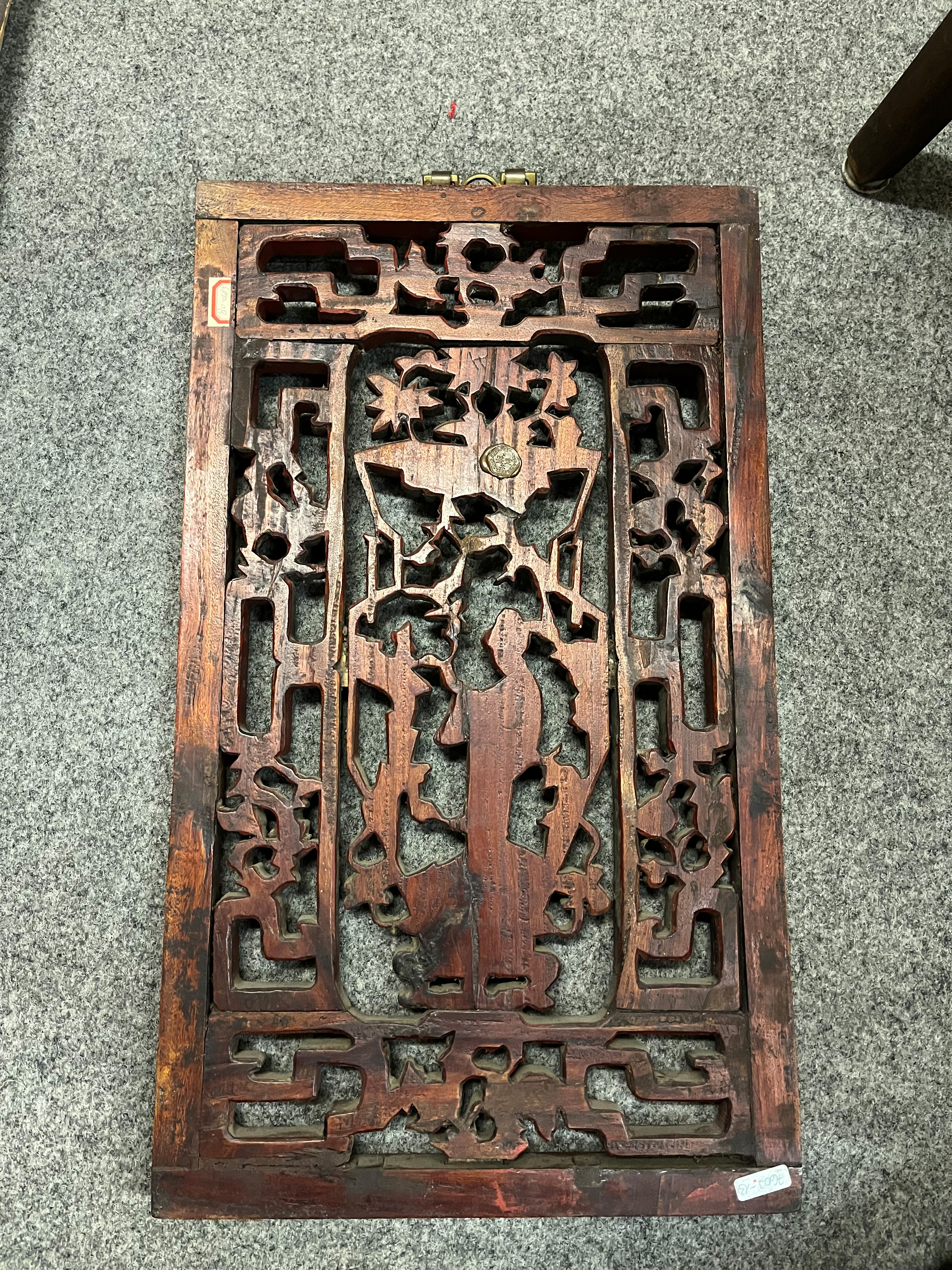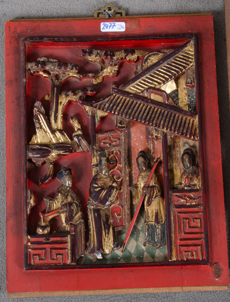 - Katalog-Nr: 2477Sechs Reliefs. Asien. Massivholz, geschnitzt mit Blumen, Figuren und Tieren, teilw. rot lackiert und gold gefasst, 13 x 12 bis 51 x 75 cm. (besch.)o.L.