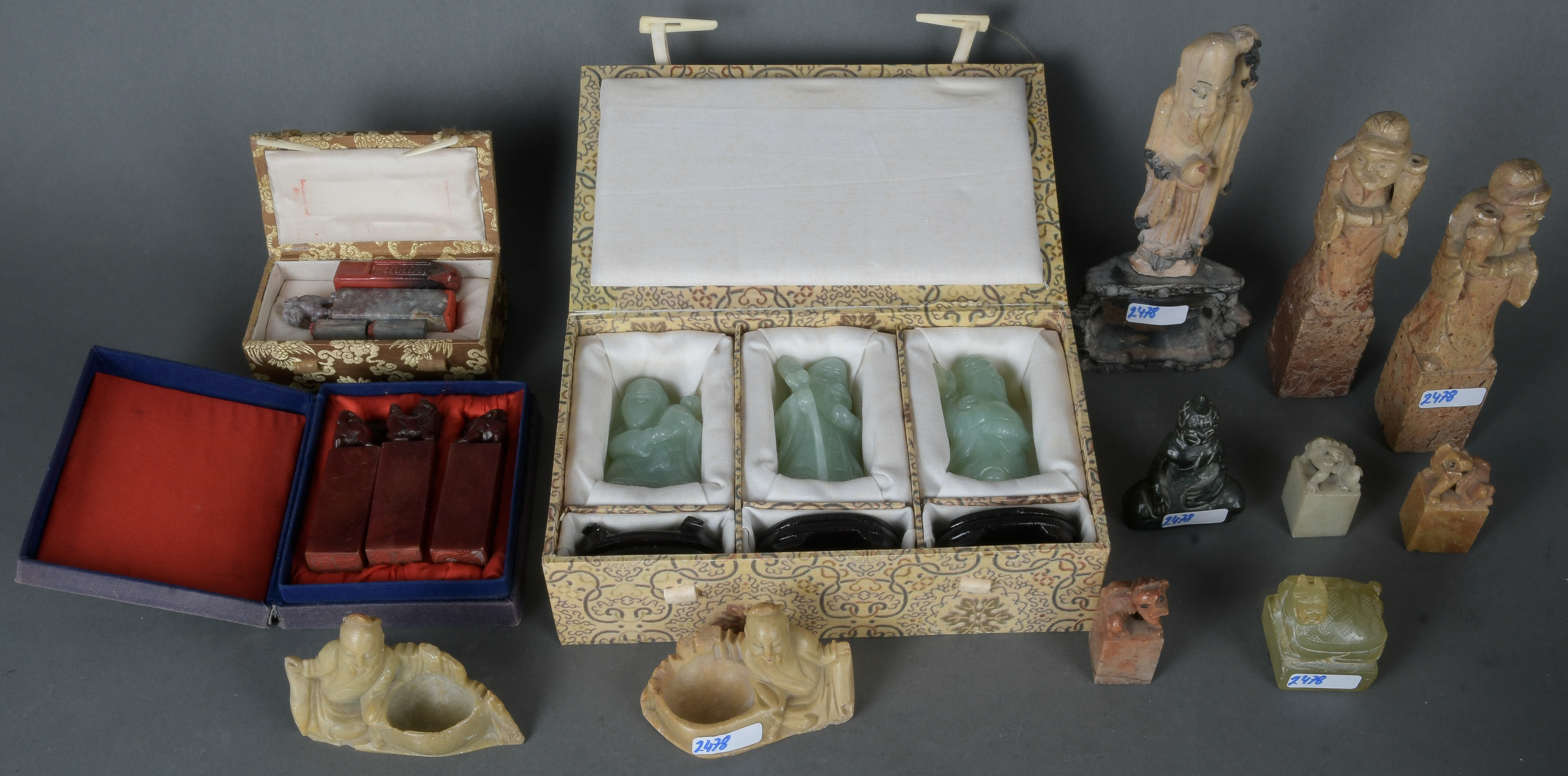 - Katalog-Nr: 247817-tlgs. Konvolut Asiatika. Jade / Speckstein, geschnitzt. Bestehend aus: Neun Figuren, drei Tierfiguren auf Sockel und fünf Stempel, teilw. in Etui, H=5 bis 16,5 cm.o.L.