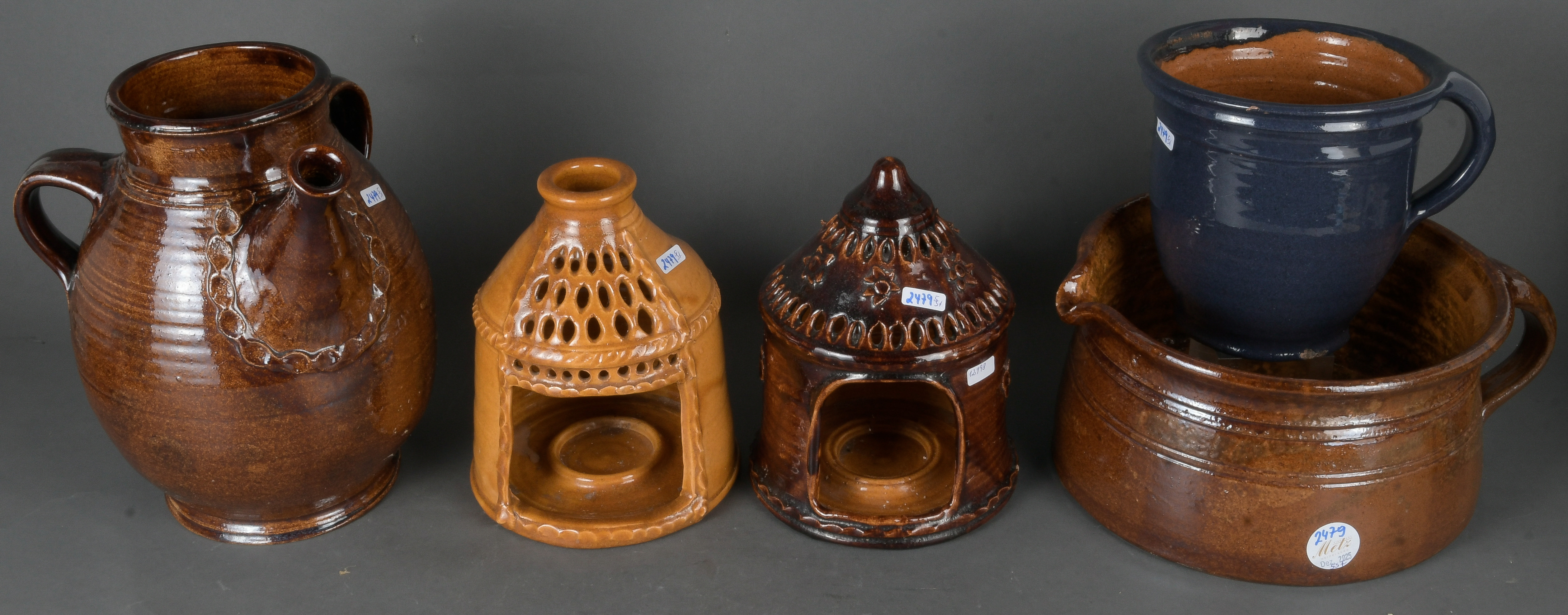 - Katalog-Nr: 2479Jörg von Manz (1939-1997). Fünftlgs. Konvolut Keramikobjekte, teilw. glasiert. Bestehend aus: Ein Henkelkrug (H=26 cm), ein Henkeltopf (H=13 cm, D=25 cm), zwei Handleuchter (H=19,5 / 20 cm) und ein Übertopf (H=17,5 cm).o.L.