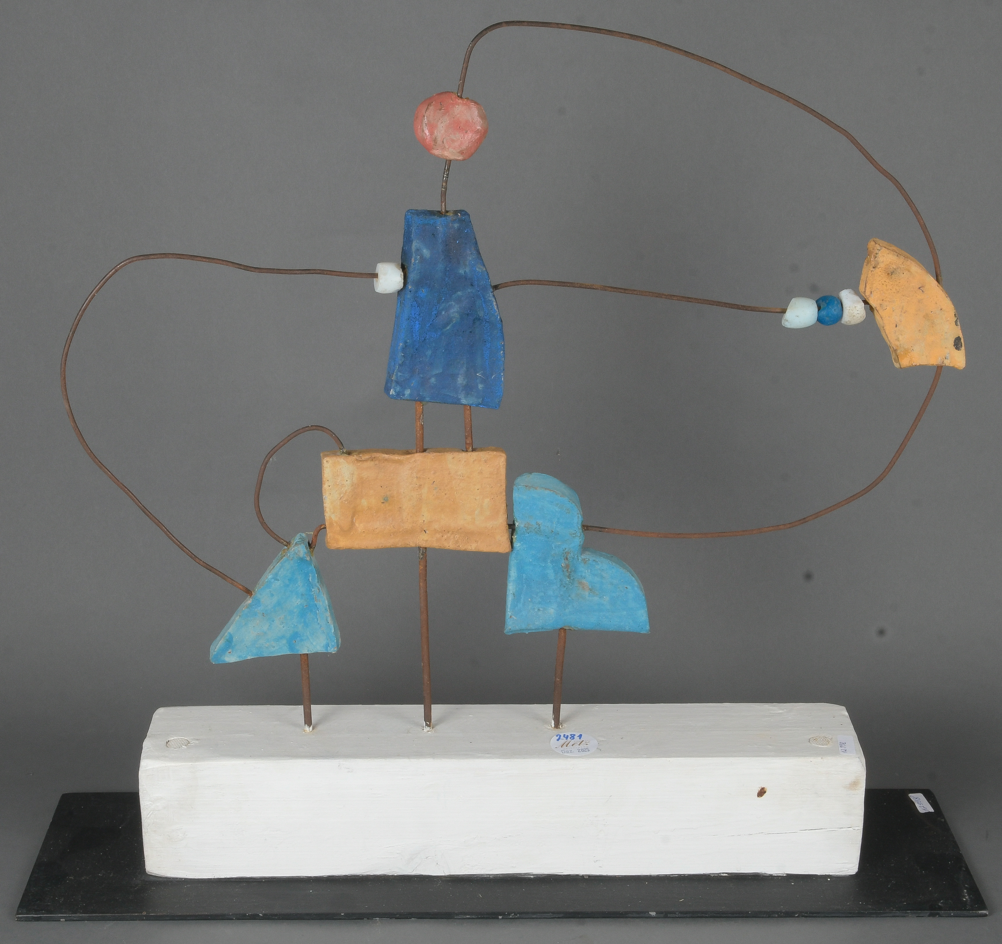 - Katalog-Nr: 2481Jörg von Manz (1939-1997). Installation aus Holz, Draht und Keramik auf Eisenplatte, H=54 cm.o.L.