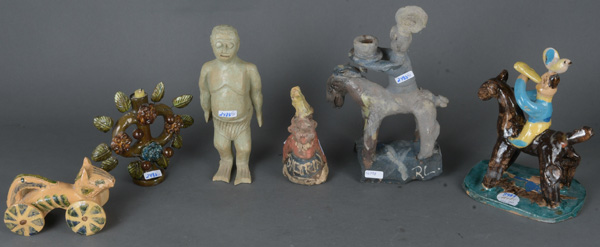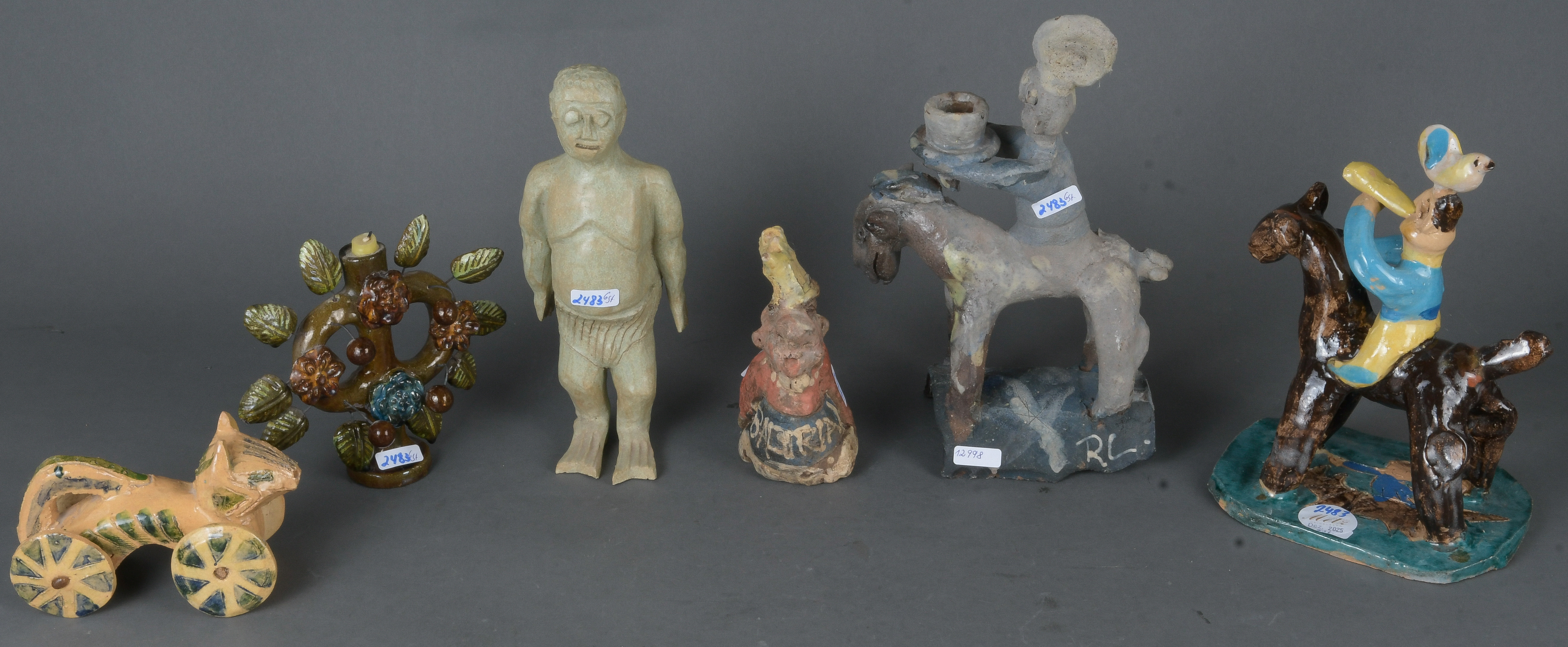 - Katalog-Nr: 2483Jörg von Manz (1939-1997) / wohl R. Ludwig (deutscher Keramiker des 20. Jhs.). Sechs unterschiedliche Keramikobjekte, u.a. Büste, Reiter, Leuchter und Katze auf Rollen, teilw. farbig glasiert und beschriftet, H=8,5 bis 26 cm.o.L.