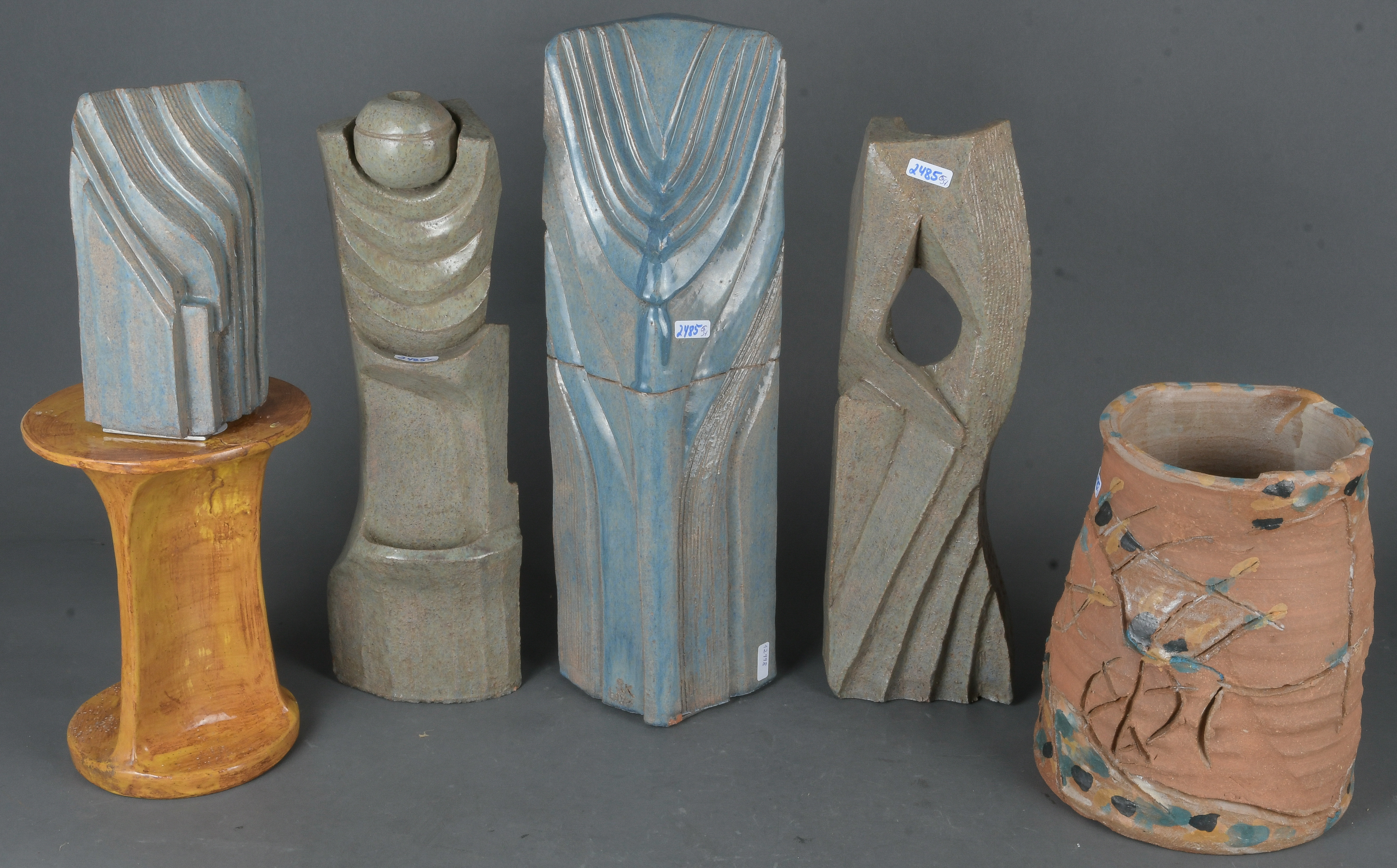 - Katalog-Nr: 2485Wohl Siegfried Kaiser (deutscher Keramiker des 20. Jhs.). Sechs unterschiedliche Keramikobjekte, farbig glasiert, H=18 bis 42 cm. (min. best.)o.L.