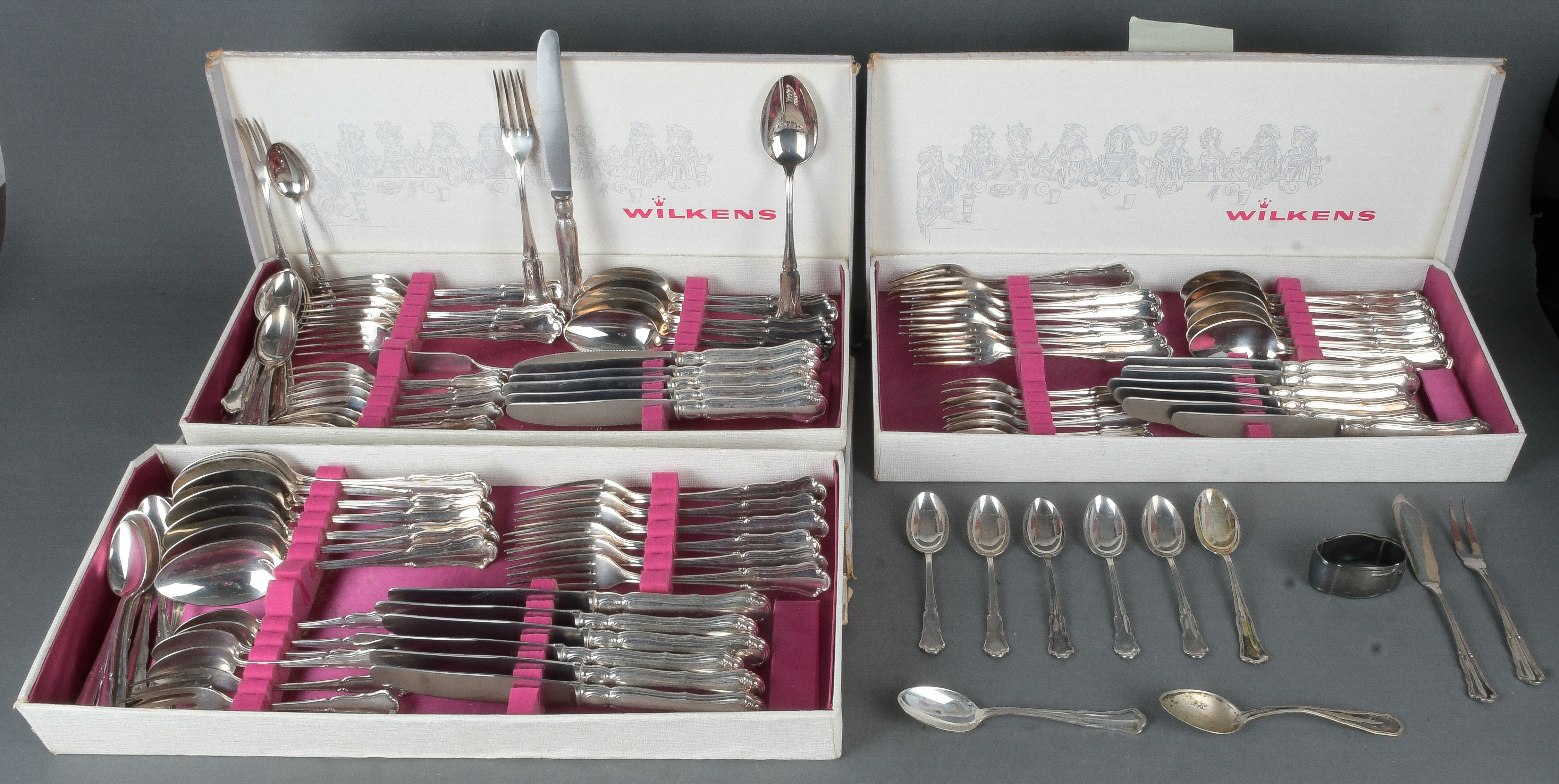 - Katalog-Nr: 2489Speisebesteck „Chippendale“. Bremen, Wilkens & Söhne 20. Jh. 800er Silber, ca. 3.385 g, bestehend aus: 18 Messer, 19 Gabeln, 17 Suppenlöffel, 17 Kuchengabeln, eine Wurstgabel, zwei Buttermesser, 30 Kaffeelöffel und ein Serviettenring, in Original-Kartons.o.L.