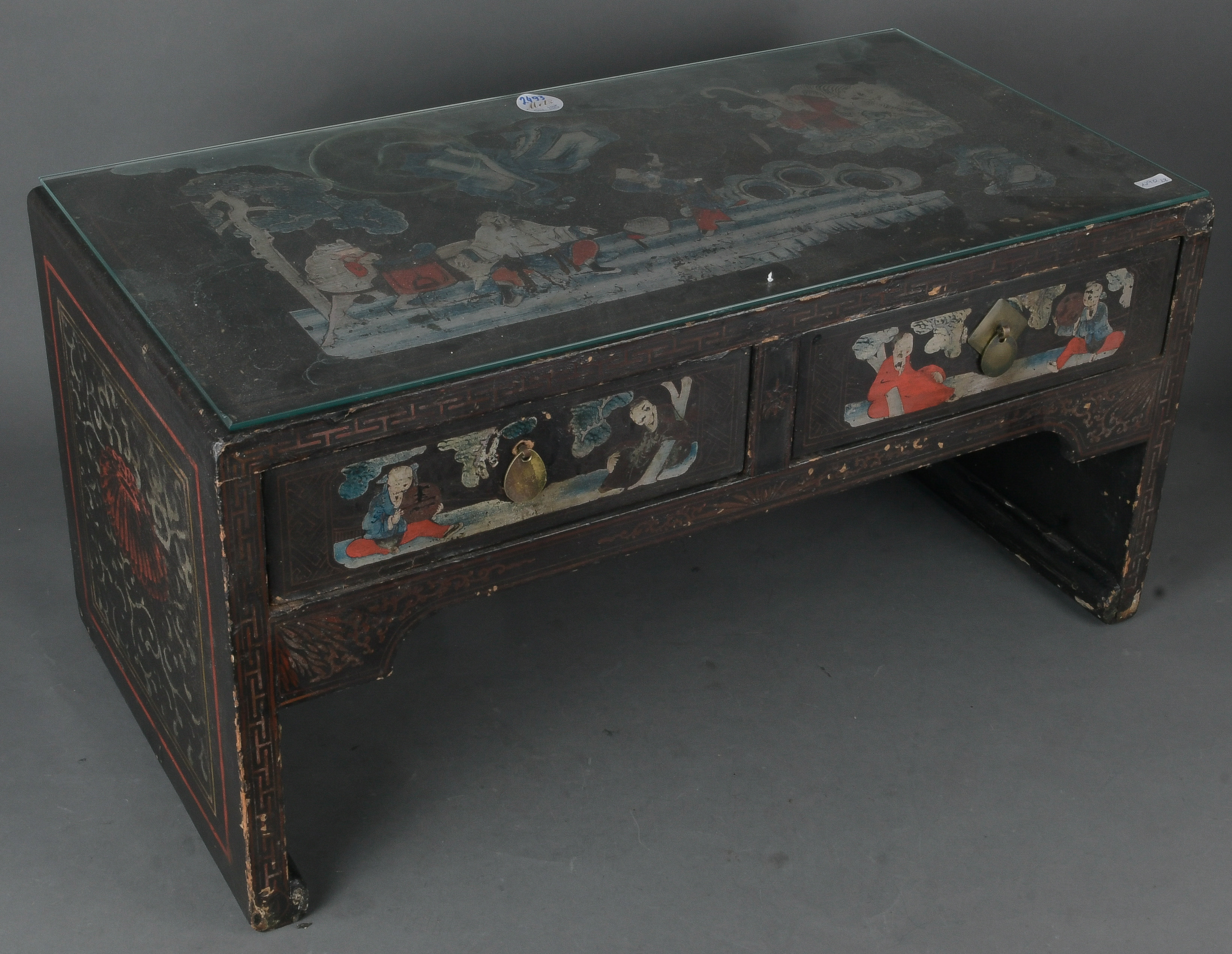 - Katalog-Nr: 2493Tisch mit Lackdekor, China Republik-Periode, Mit zwei Schüben. Holz, bunt bemalt, H=32 cm, B=63 cm, T=31,5 cm. Provenienz: Aus altem hessischen Privatbesitz. (Altersschäden)o.L.