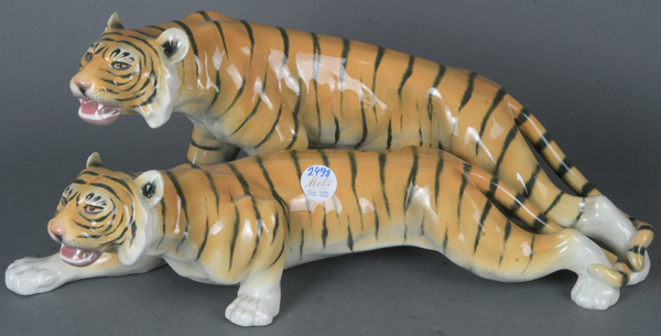 - Katalog-Nr: 2498Tigerpaar. Volkstedt 20. Jh. Keramik, bunt bemalt; am Boden gemarkt, H=22 cm, B=52 cm, T=28 cm. (besch.)o.L.